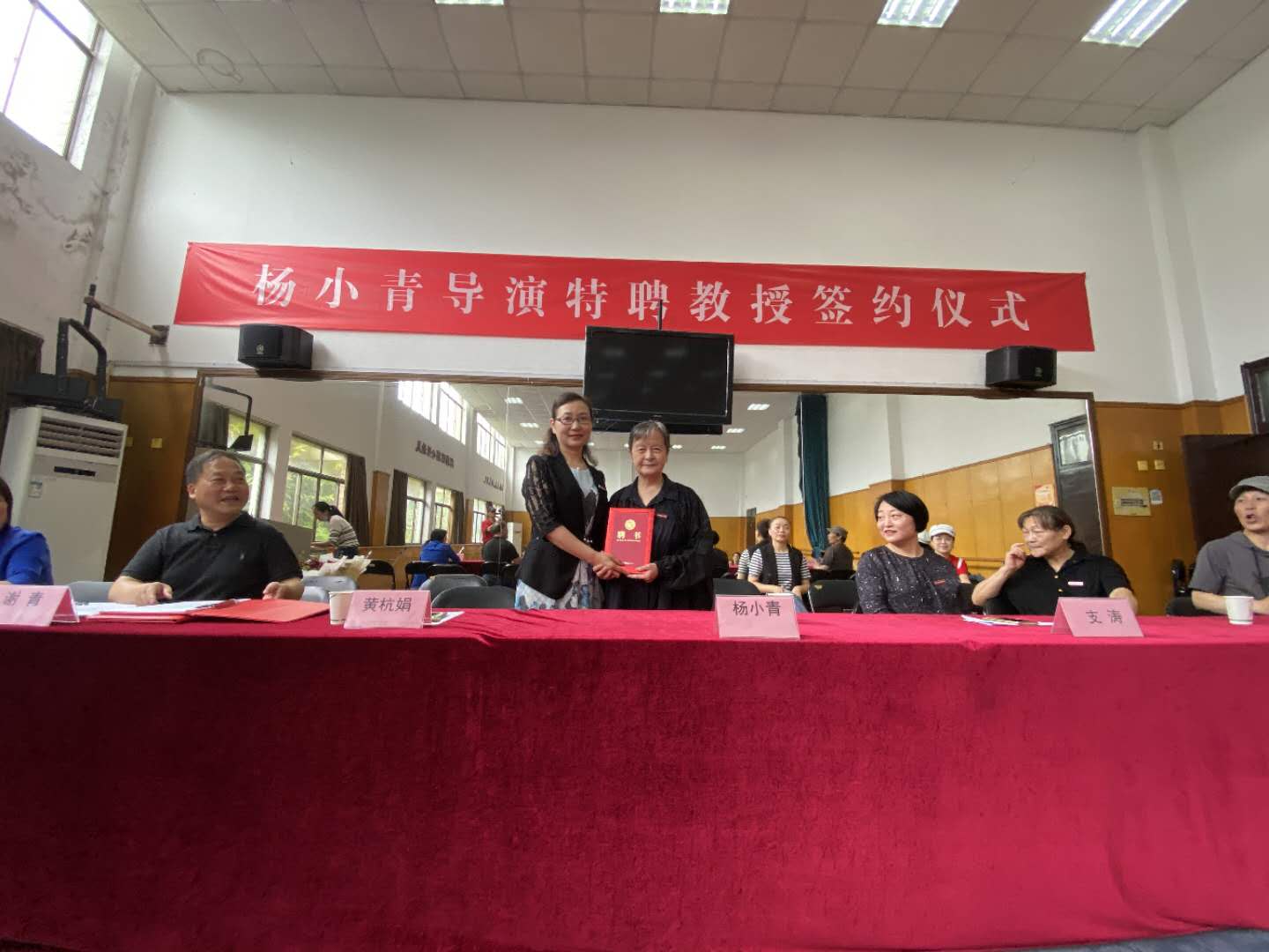 浙江艺术职业学院院长黄杭娟,副院长支涛,著名导演杨小青,戏曲学院党总支书记、副院长谢青,戏曲学院副院长周伟君,戏曲学院党总支专职副书记杨晓浤,浙江小百花越剧院一级演员、梅花奖得主周云娟、华渭强与戏曲学院教师代表、2016级戏曲表演(浙江小百花越剧院男女合演)班全体同学参加。仪式上,黄杭娟为杨小青颁发特聘教授聘书,谢青与杨小青签订特聘教授协议。