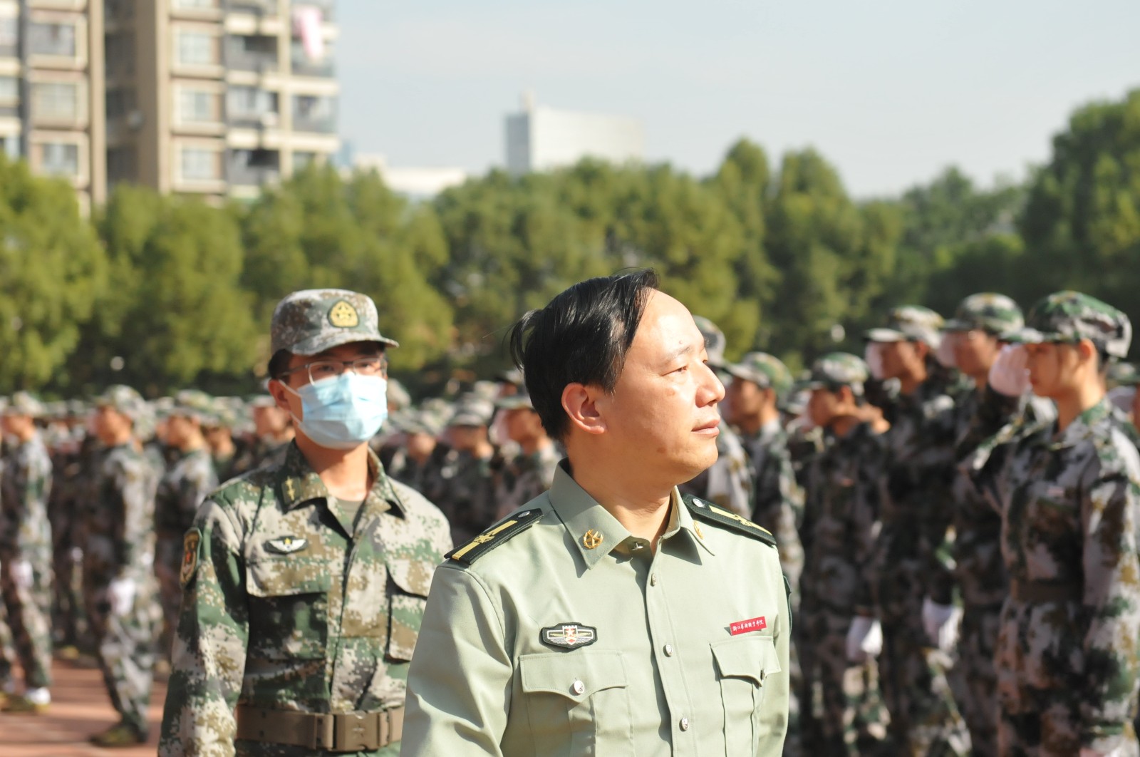 党委副书记夏开堂对新生进行检阅。