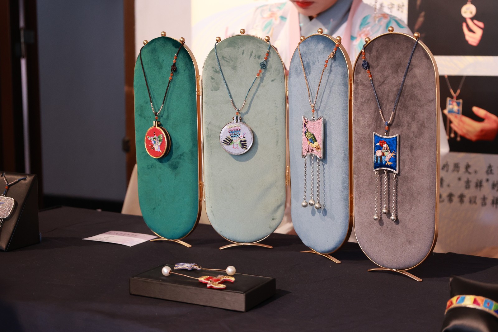 琪花瑶草以屏风为载体,将四个不同季节的花草纹样从古老肚兜绣片中提取出来,重新搭配现代色彩,结合多种针法让图案更具立体感。另有扇面作品以传统纹样、清代绣片图案及齐白石的画作为素材,将美好的传统文化内涵在手作中传递下去。