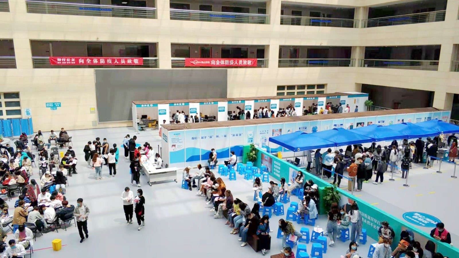 方舱临时接种点按照流程设置了多个功能区域,进出都是单向通行,设置有多条引导咨询通道,12个预检台、16个接种室、上百个留观座位,确保接种工作顺利进行。