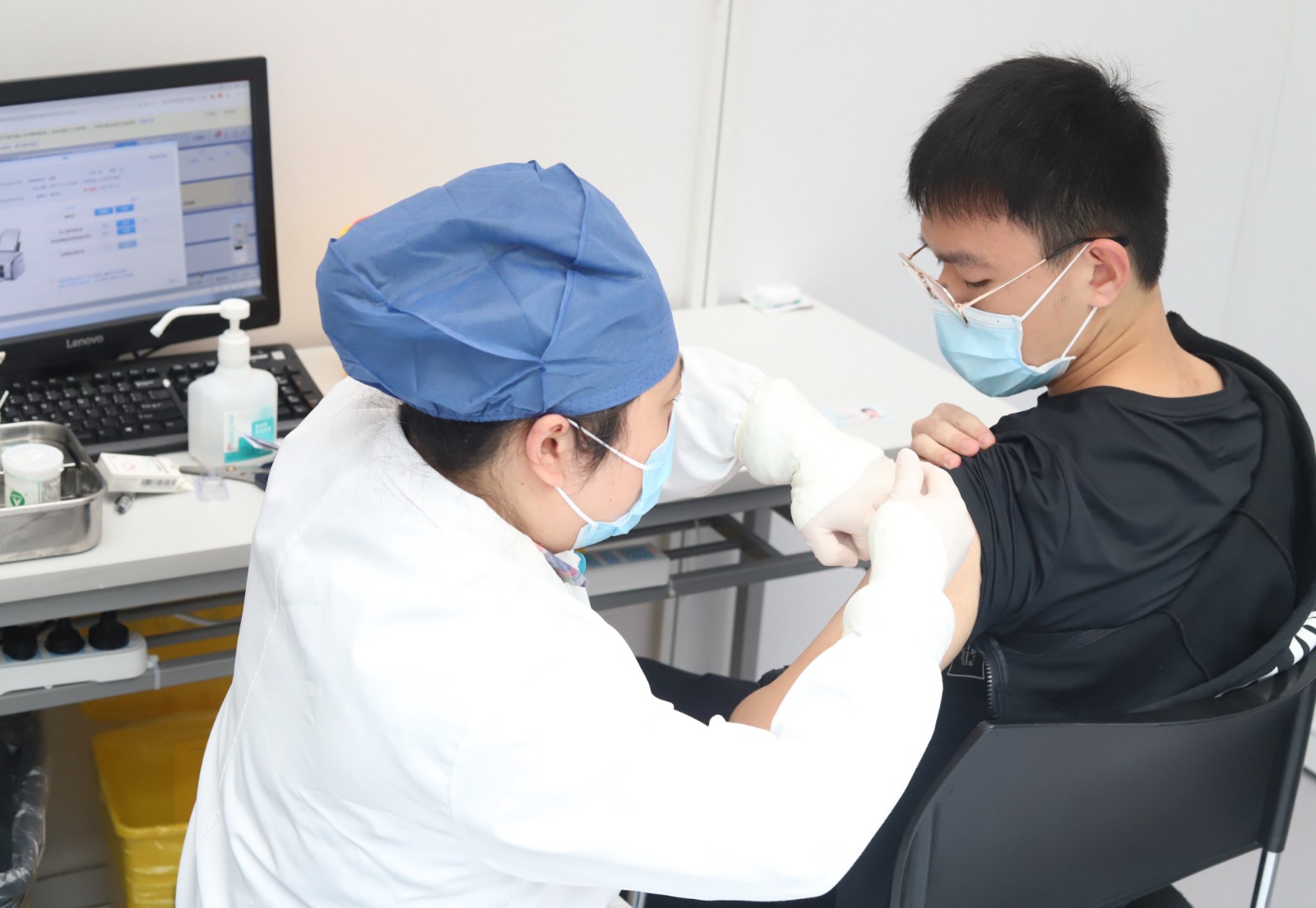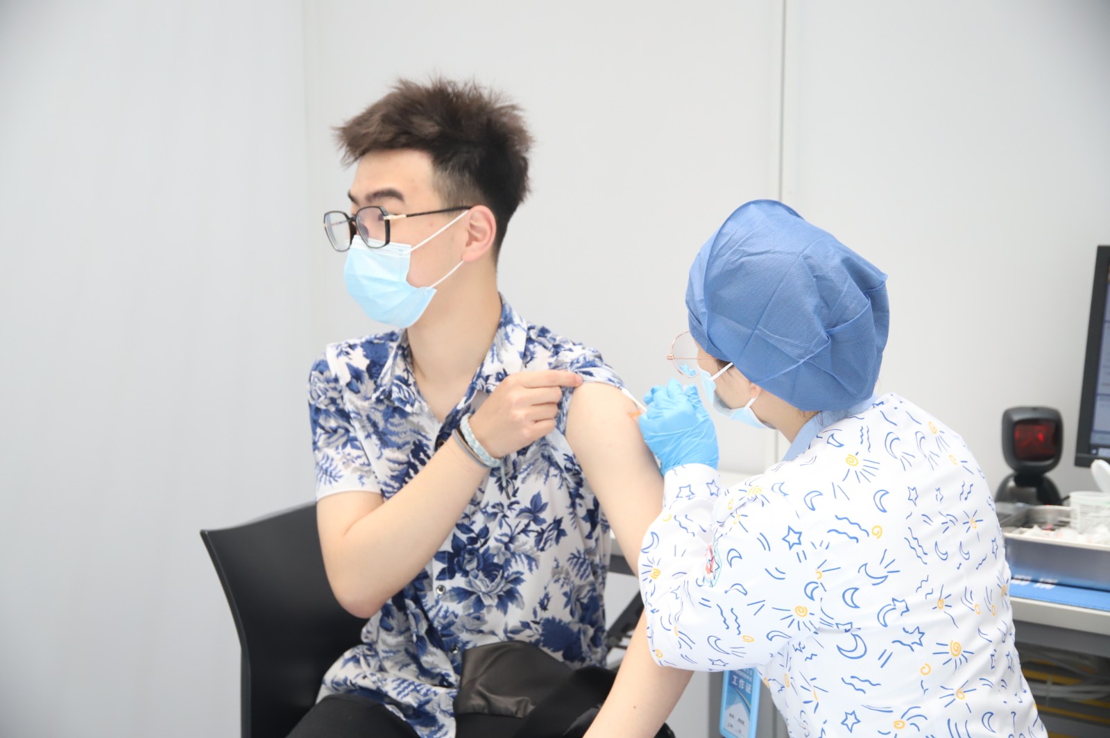 一大早就在接种点打疫苗的美术系2019级舞美班朱昌华说:“免费接种了新冠疫苗,留观半小时,保护好自己的同时,也是保护他人。只有做到群体免疫,才能控制住疫情再次大面积复发。接种疫苗,人人有责!”