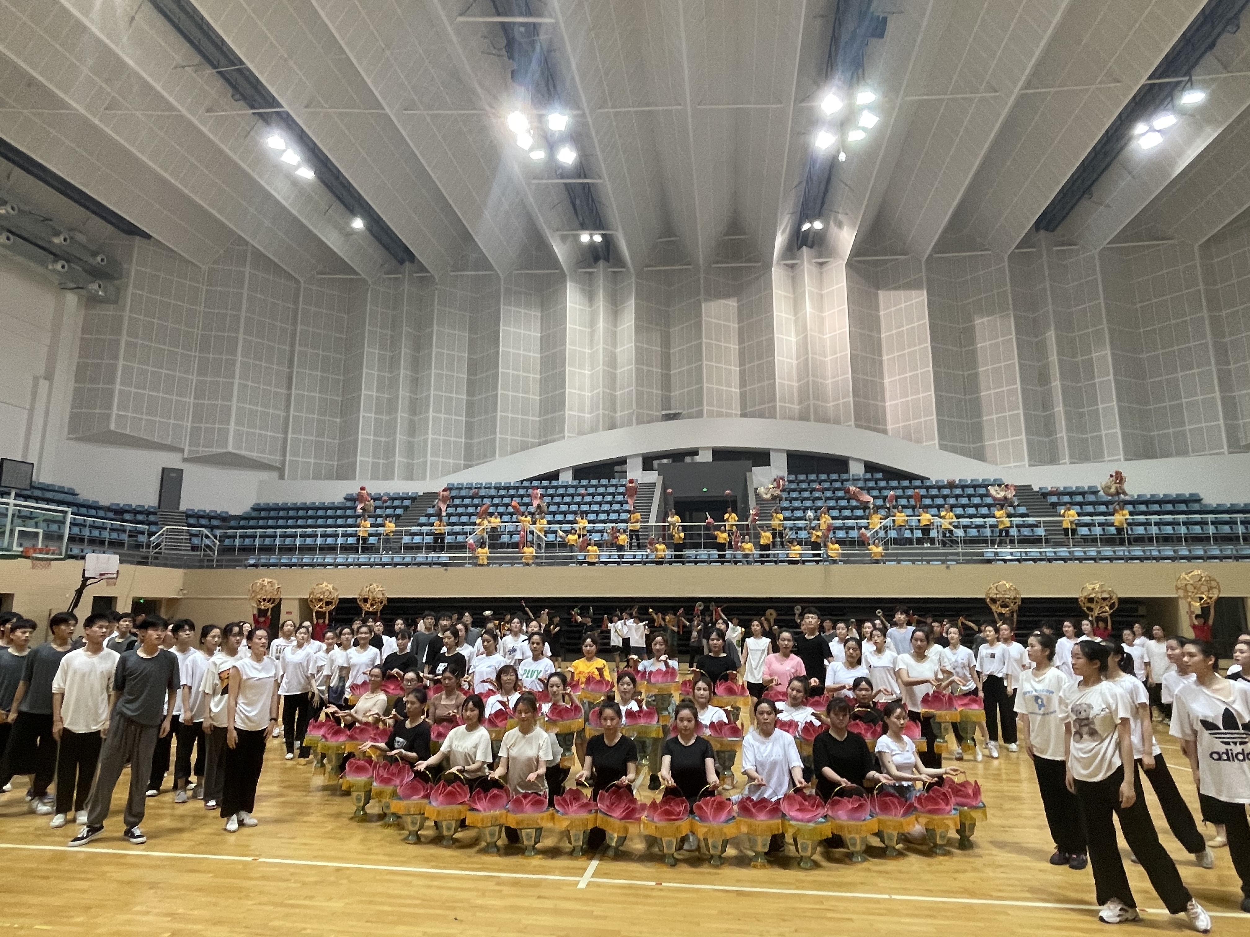 5月15日,舞蹈系主任张星与本次晚会总导演施国庆老师进行沟通协调,及时解决了体育馆空调问题,保证了排练顺利进行。数日来,舞蹈系的教务老师、任课老师和几个班的班主任积极配合,协商调整上课时间。教学实践部焦峤等老师多次联络工作到深夜;浙艺车队的王磊等司机师傅起早贪黑争分夺秒的运送师生队伍;舞蹈系学生们团队意识强和组织纪律性强的特点在本次排练中得以表现,他们排练认真卖力,每天自觉统一排练服装,步调一致,保证了排练的高效率、高质量,有时还会反过来关照到老师们的辛苦,暗暗地为老师准备茶水。