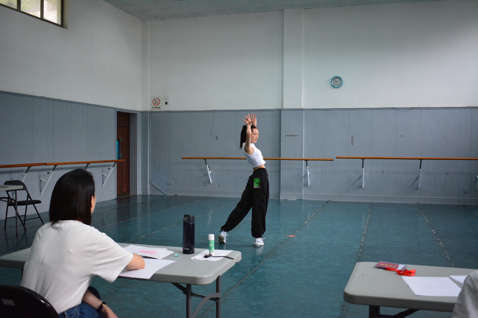 清晨,5号楼内,考官、考务人员、志愿者早早就绪等待考生进场。候考室内,志愿者宣讲了考试流程,贴心地给候考同学分发小零食,缓解紧张情绪。考生们抓紧时间练习舞蹈,朗诵台词,开嗓,耐心等待考试。音乐剧专业需要有一定艺术专业基础,专业面试从声乐、形体、台词、视唱练耳四个方面综合考量考生的专业素质,考官由浙艺和浙传的专业老师共同组成。