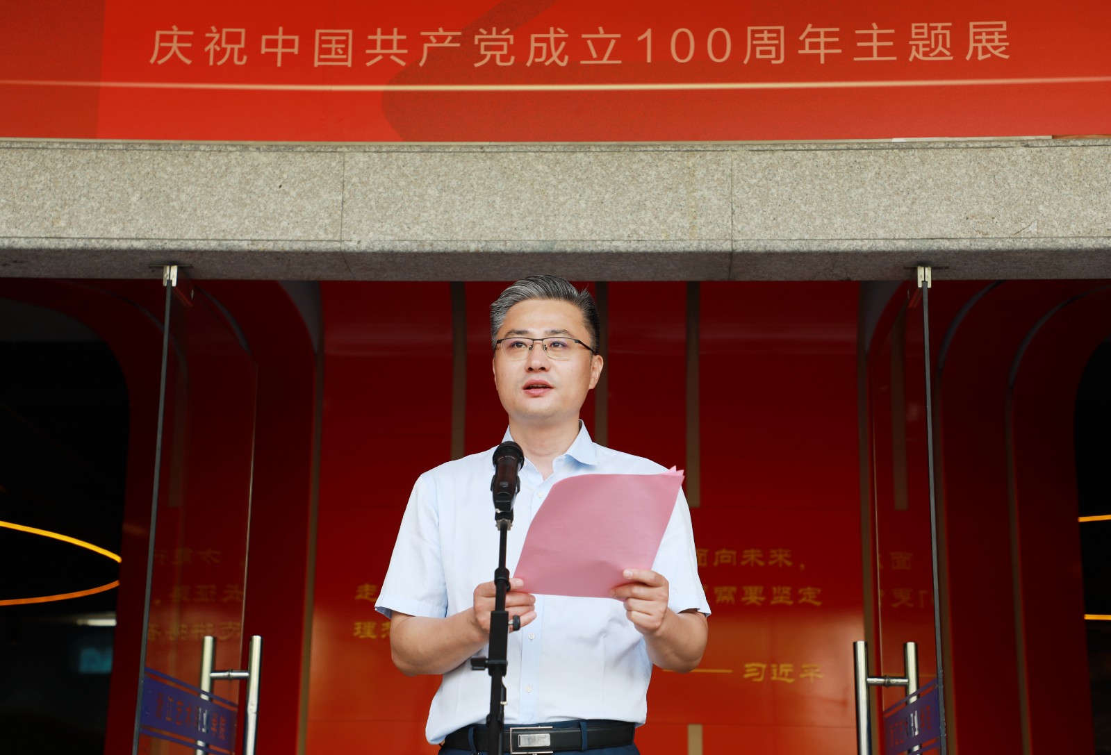 薛亮致辞。他表示,此次展览是浙江艺术职业学院坚定育人初心,赓续精神血脉,立足艺术特色,以美术作品的形式呈现百年党史的生动实践,是党史学习教育的有效载体。他希望通过打造美术作品与党史交织相融的互动型党史教育,将艺术教育、情感体验、理论阐释、价值引导融为一体,深化习近平新时代中国特色社会主义思想铸魂育人长效机制建设。希望老师们不忘教师初心,牢记育人使命,为推动学校“十四五”高质量发展,助力我省“重要窗口”建设和高质量发展建设共同富裕示范区贡献更多聪明才智。希望同学们志存高远、脚踏实地,努力在实现中华民族伟大复兴的中国梦中书写精彩人生。