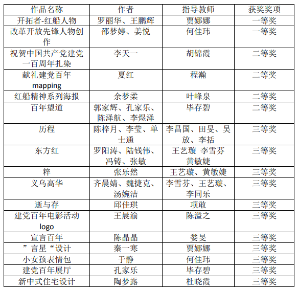 我校“百年奋斗·初心弥坚”献礼建党百年设计作品大赛,自今年3月底开始作品征集以来,共收到来自学校音乐系、美术系、影视技术系、文化管理系293件设计作品。经过专业和专家的两轮评审,最终评选出一等奖2名,二等奖4名,三等奖10名,优秀指导教师6名。