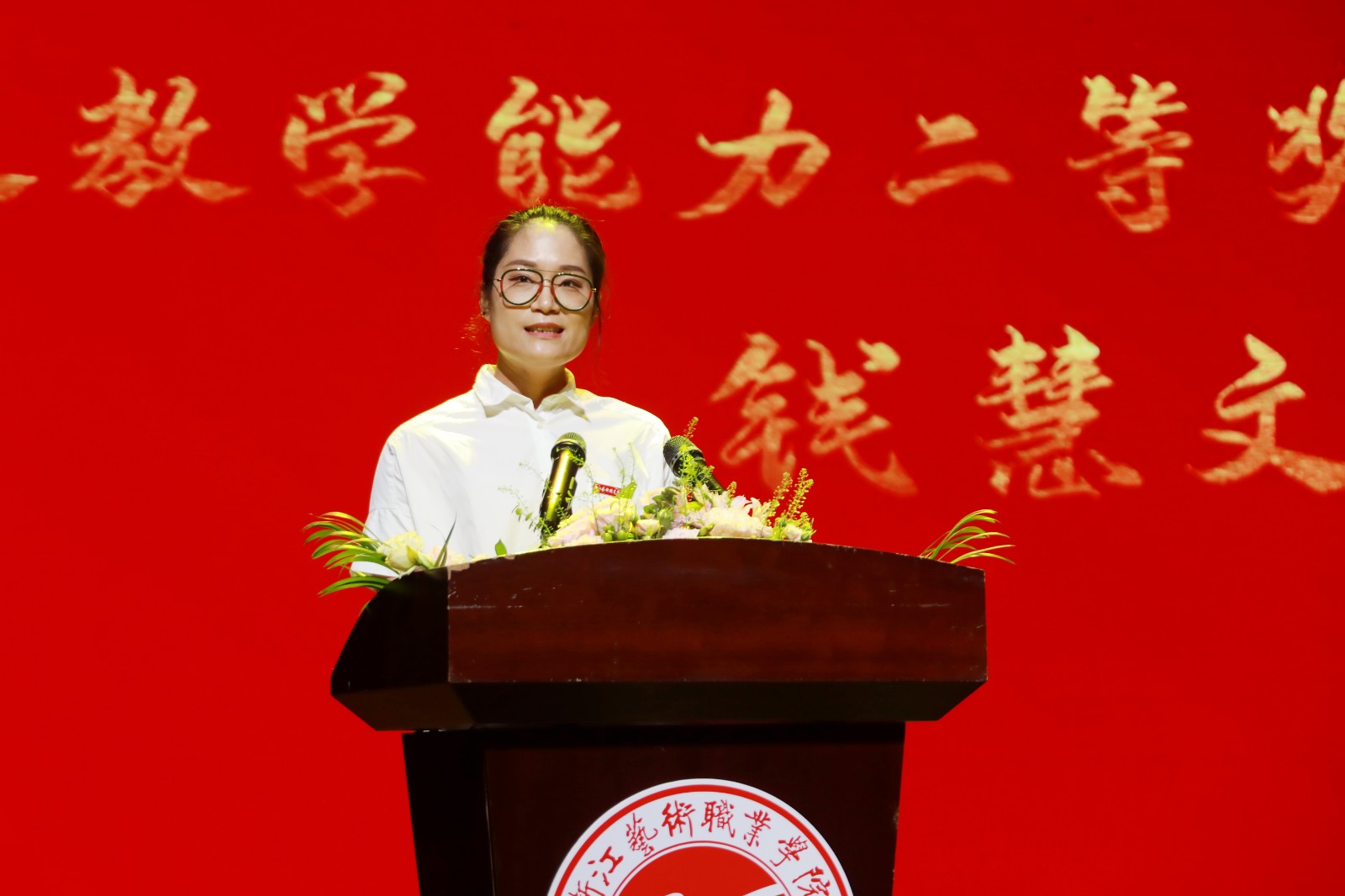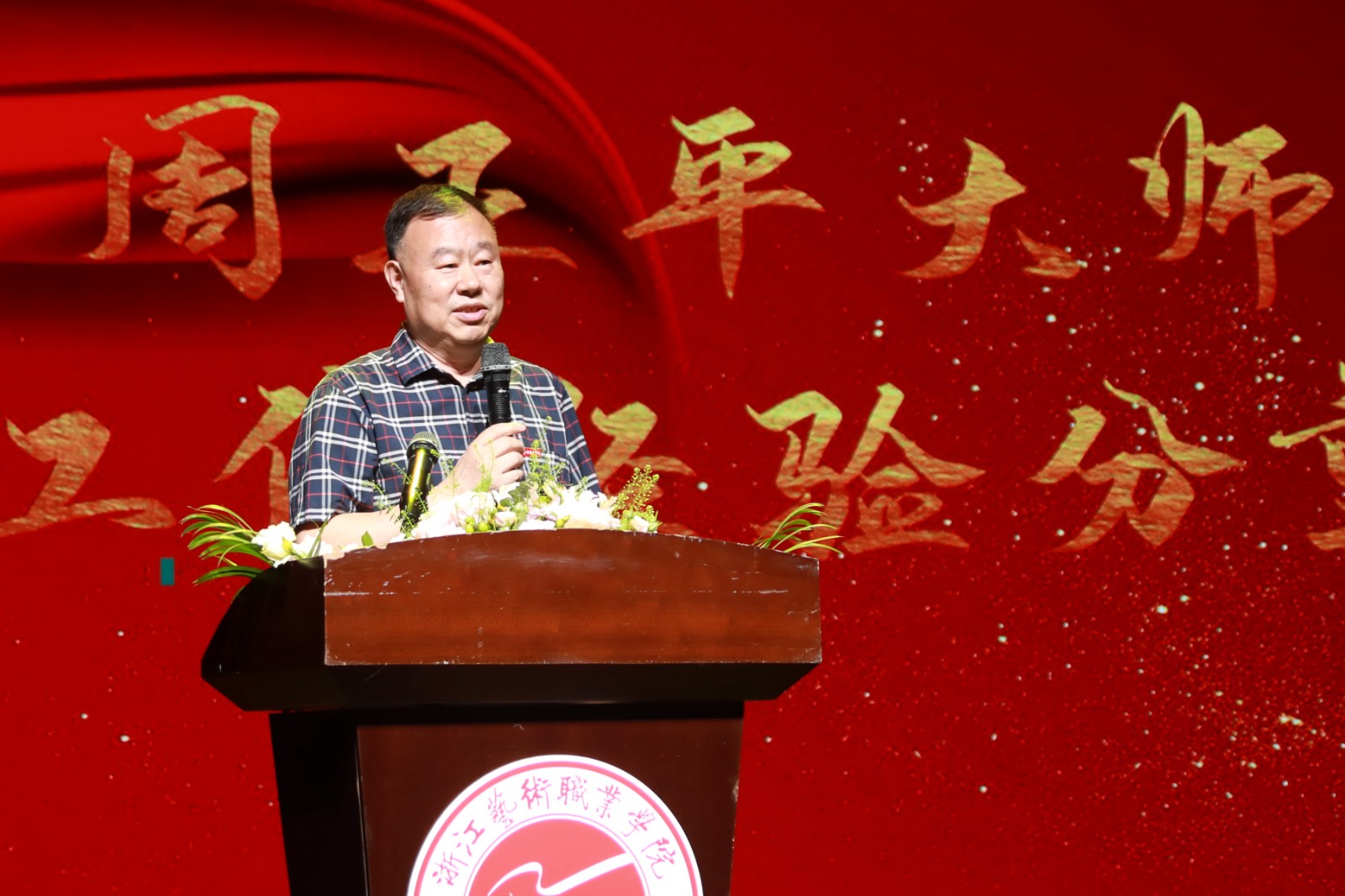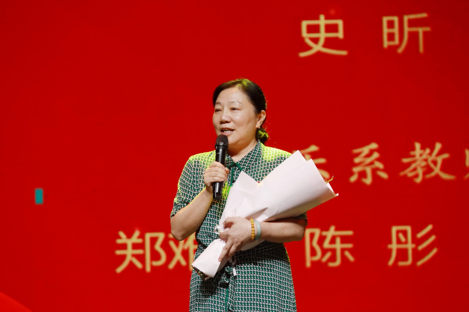 4位活跃在学校教育教学、党建思政、管理服务等一线的优秀教师和教育工作者代表夏金瓯、钱慧文、王玉簪、颉顺虎分享了教育教学工作经验;文化管理系2019级公共文化定向2班吴京涛作为学生代表,向老师们送上了节日祝福。