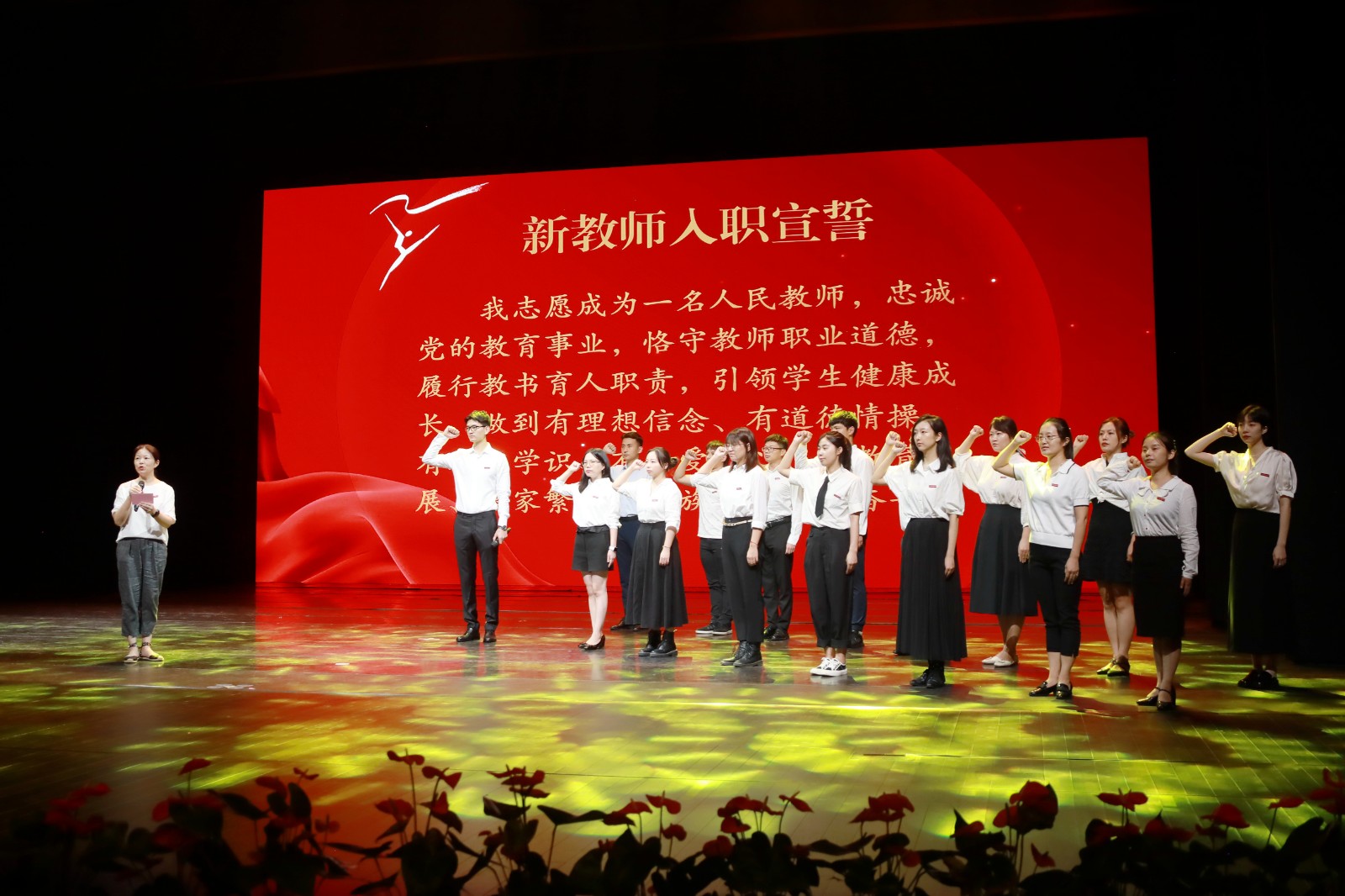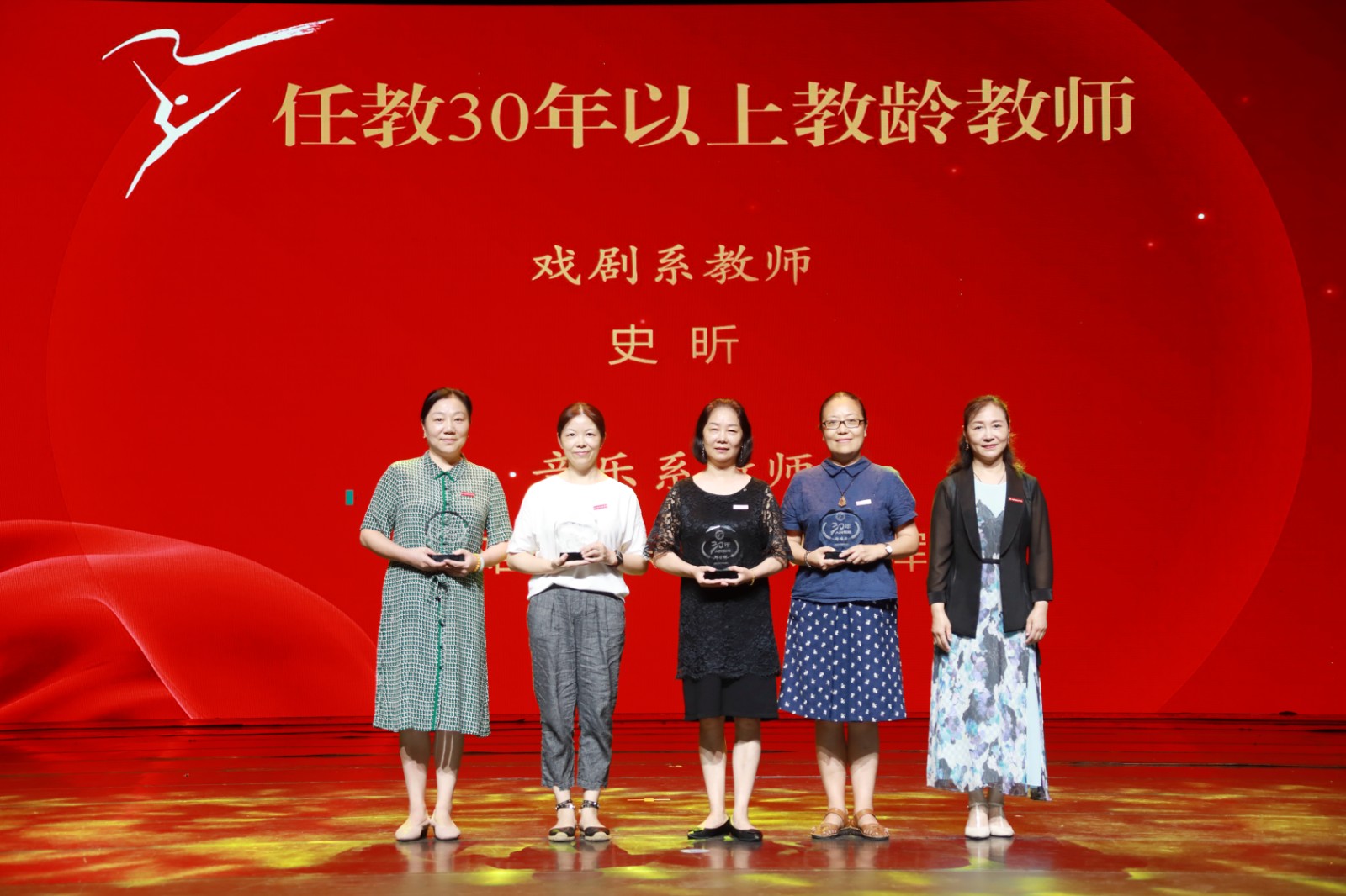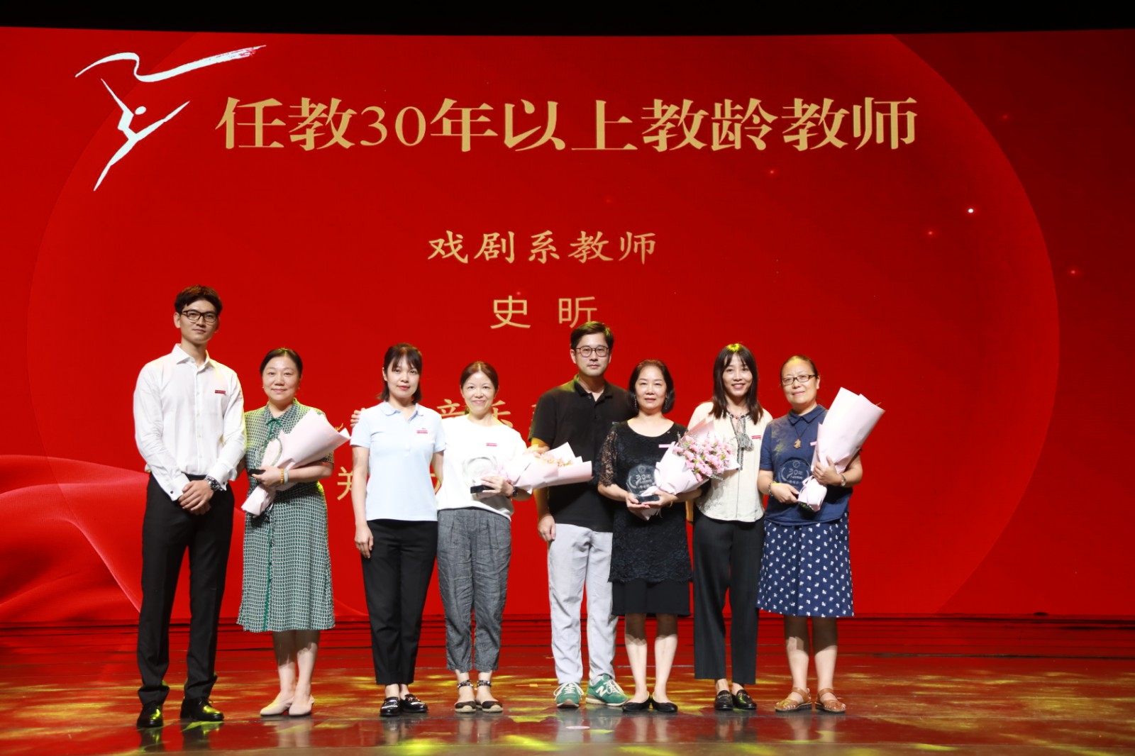 大会30年教龄教师戏剧系史昕、音乐系郑难力、陈彤和邓世晖颁发纪念牌。史昕表示,能从事自己热爱的事业非常幸运,每天和充满阳光朝气的学生在一起,我们就拥有了一个不会老去的灵魂和一颗不会老去的心。希望学校的青年老师们,不断创新,培养出一批批人才,结出累累硕果。黄龙文脉代代守护,浙艺精神代代相传,现场4位青年教师为老教师献上鲜花,接续传承。陈彤带领新教师进行入职宣誓