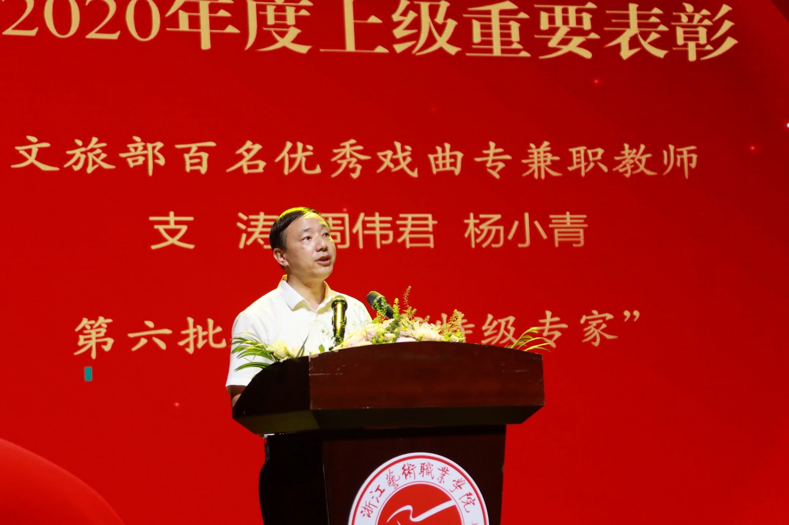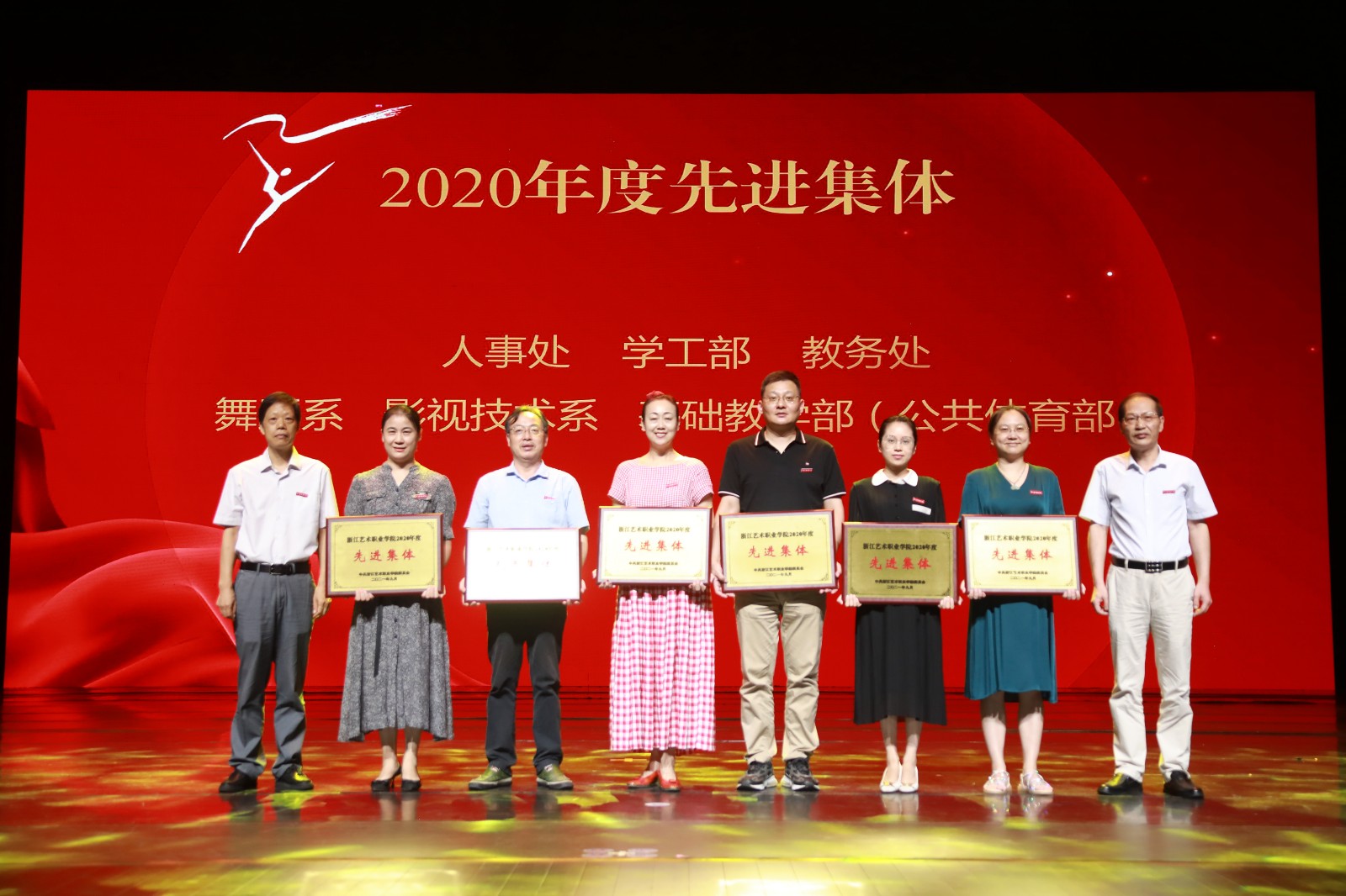 大会表彰了2020年度校先进集体、优秀干部、优秀教师、优秀教育工作者,宣读了2020年度浙江艺术职业学院课堂教学优秀奖,2019-2020学年优秀班主任和优秀辅导员,2020年度就业工作先进集体和先进个人等荣誉名单。通报表彰了文化和旅游部百名优秀戏曲专兼职教师支涛、周伟君、杨小青,第六批“浙江省特级专家”、美术系首席专家周正平。校党委班子成员为先进集体和个人颁奖。