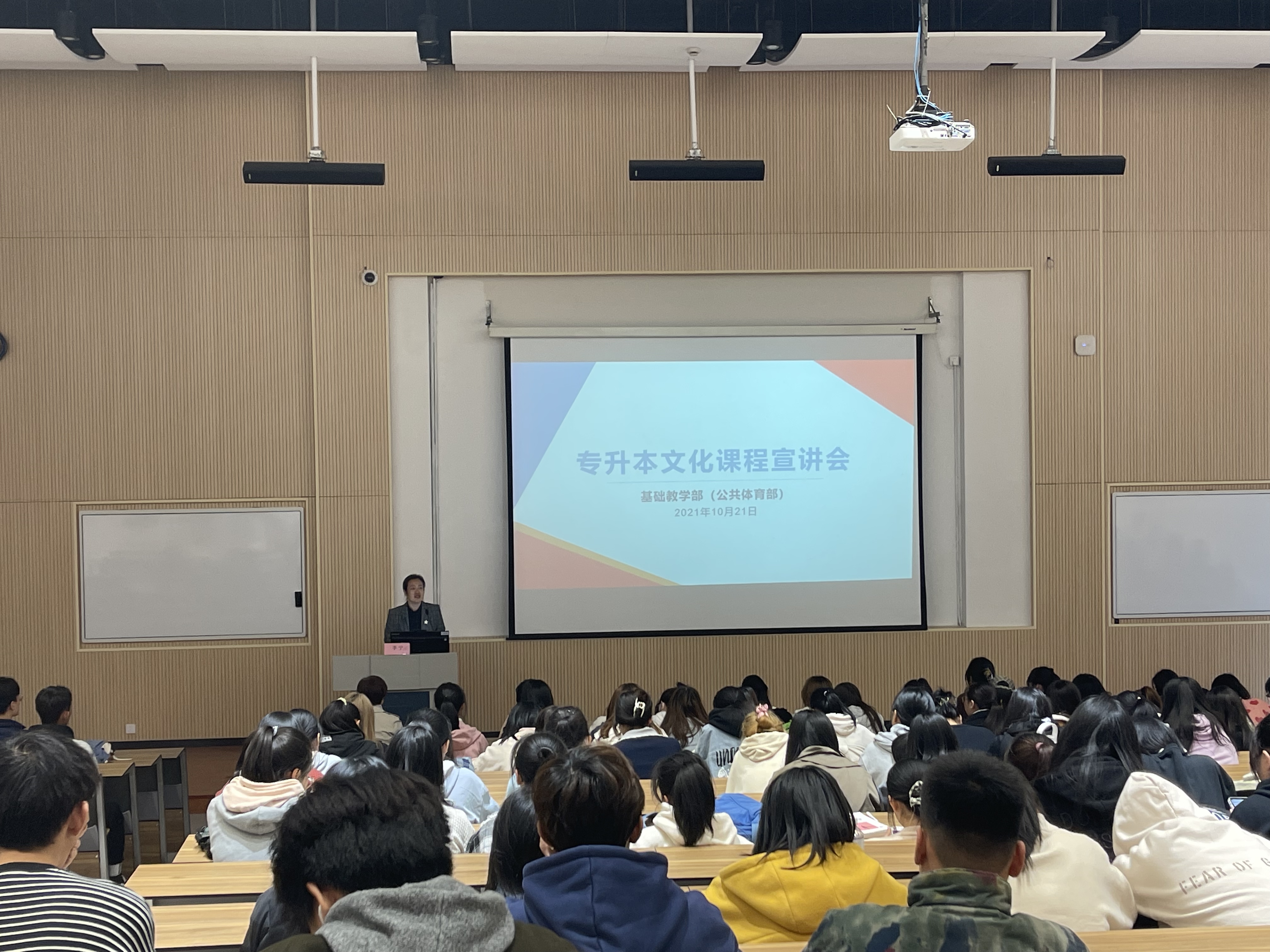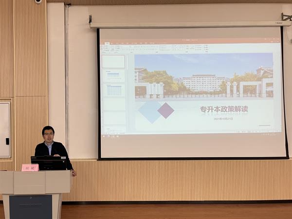 为解决同学们关于专升本的疑问邀请招生就业办公室副主任顾斌和基础教学部副主任李宁作讲座。顾斌向同学们展示本校历年报考数据录取率以及往年全省招录比,让同学们更加直观的了解我校专升本情况。并对专升本政策进行解读,重点介绍统招专升本相关内容,如报考条件、考试科目、考试方式和试卷结构等内容,并详细分析专升本各类别所含专业对照。