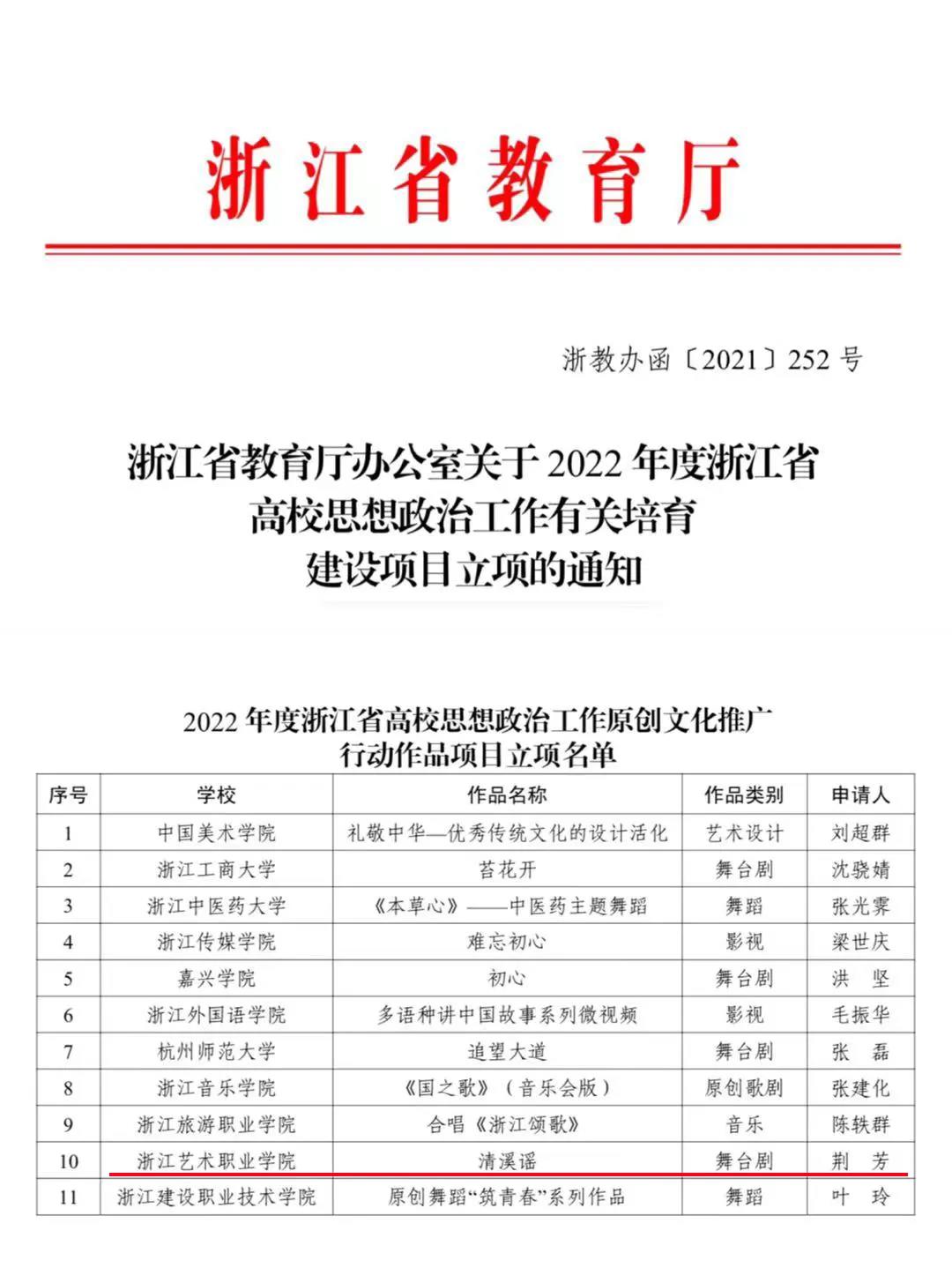 近日,浙江省教育厅公布了2022年度浙江省高校思想政治工作有关培育建设项目。经高校申报、专家评审和网络公示等程序,全省共有11所高校立项2022年度浙江省高校思想政治工作原创文化推广行动作品,我校戏剧系原创话剧《清溪谣》获立项。