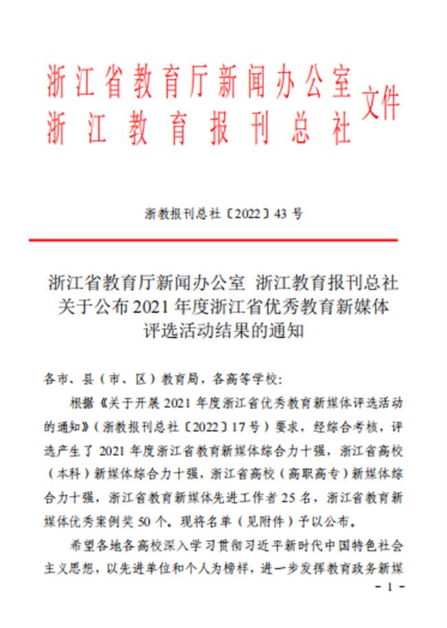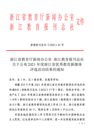 近日,浙江省教育厅新闻办公室、浙江教育报刊总社公布了2021年度浙江省优秀教育新媒体评选活动结果,浙江艺术职业学院荣获浙江省高校(高职高专)新媒体综合力十强。