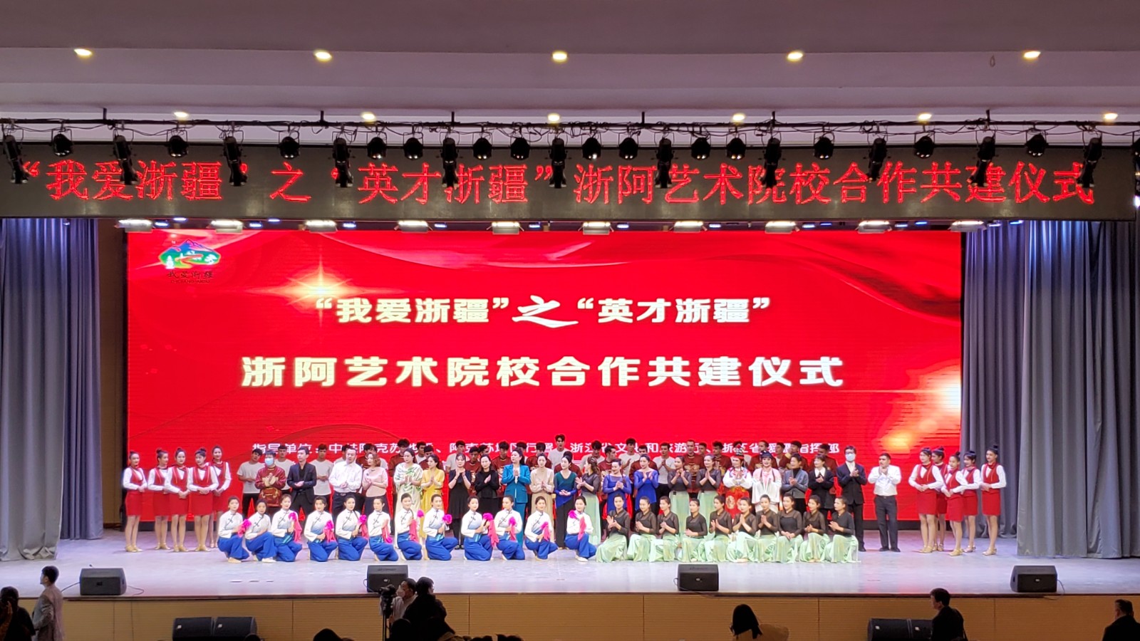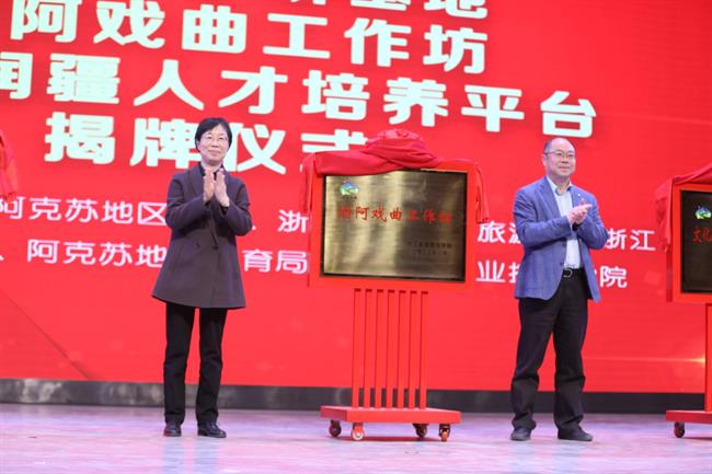 省文化和旅游厅党组成员、副厅长朱海闵,省援疆指挥部党委副书记、副指挥长王忠民,阿克苏地委委员、宣传部部长常玉轩出席浙阿艺术院校合作共建仪式,为共建产学研基地、文化润疆人才培养平台、浙阿戏曲工作坊分别揭牌,观摩“组团式”文化援疆成果汇报。