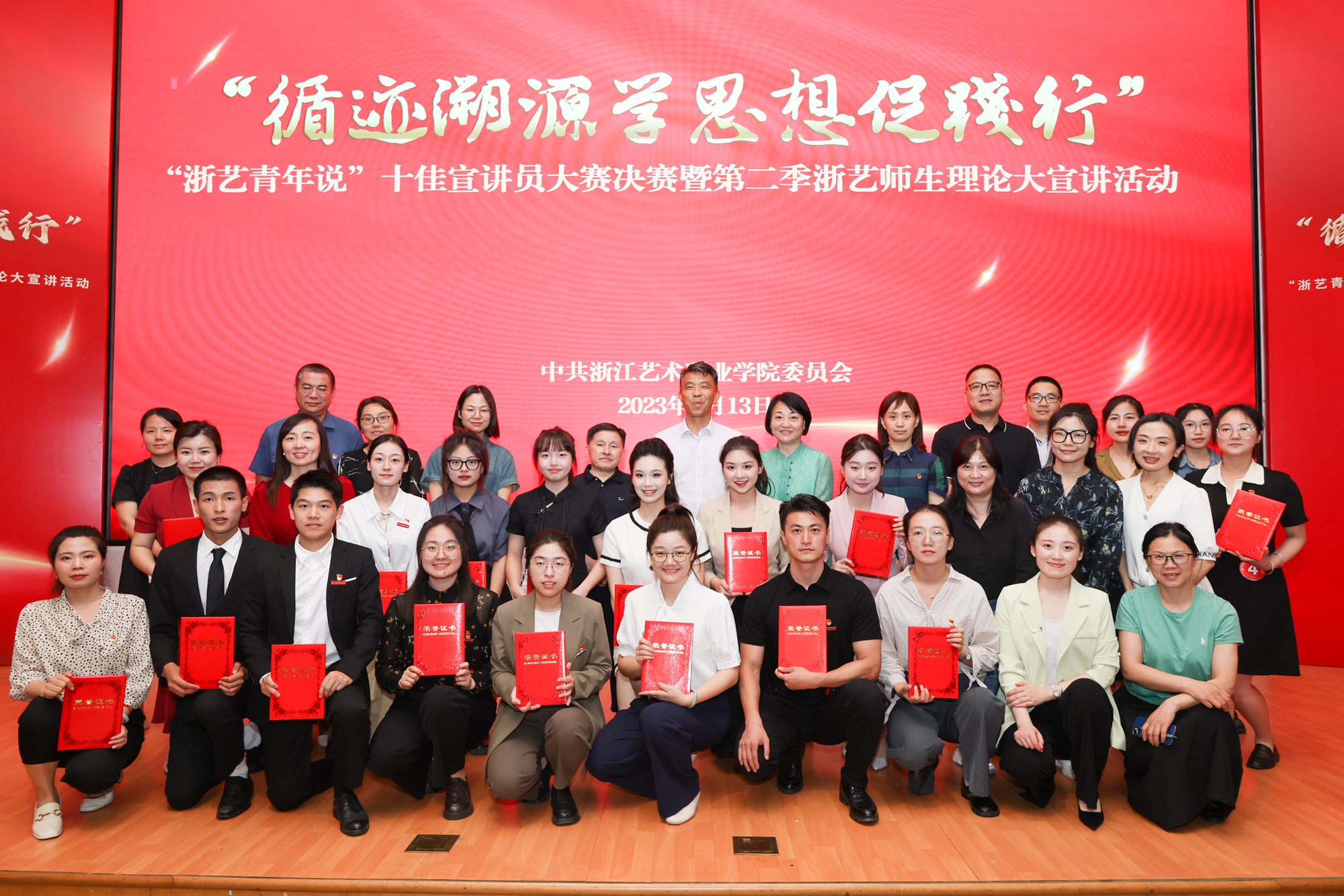 校党委委员、副院长沈军甫,党委委员、副院长支涛为“浙艺青年说”十佳宣讲员称号获得者颁奖