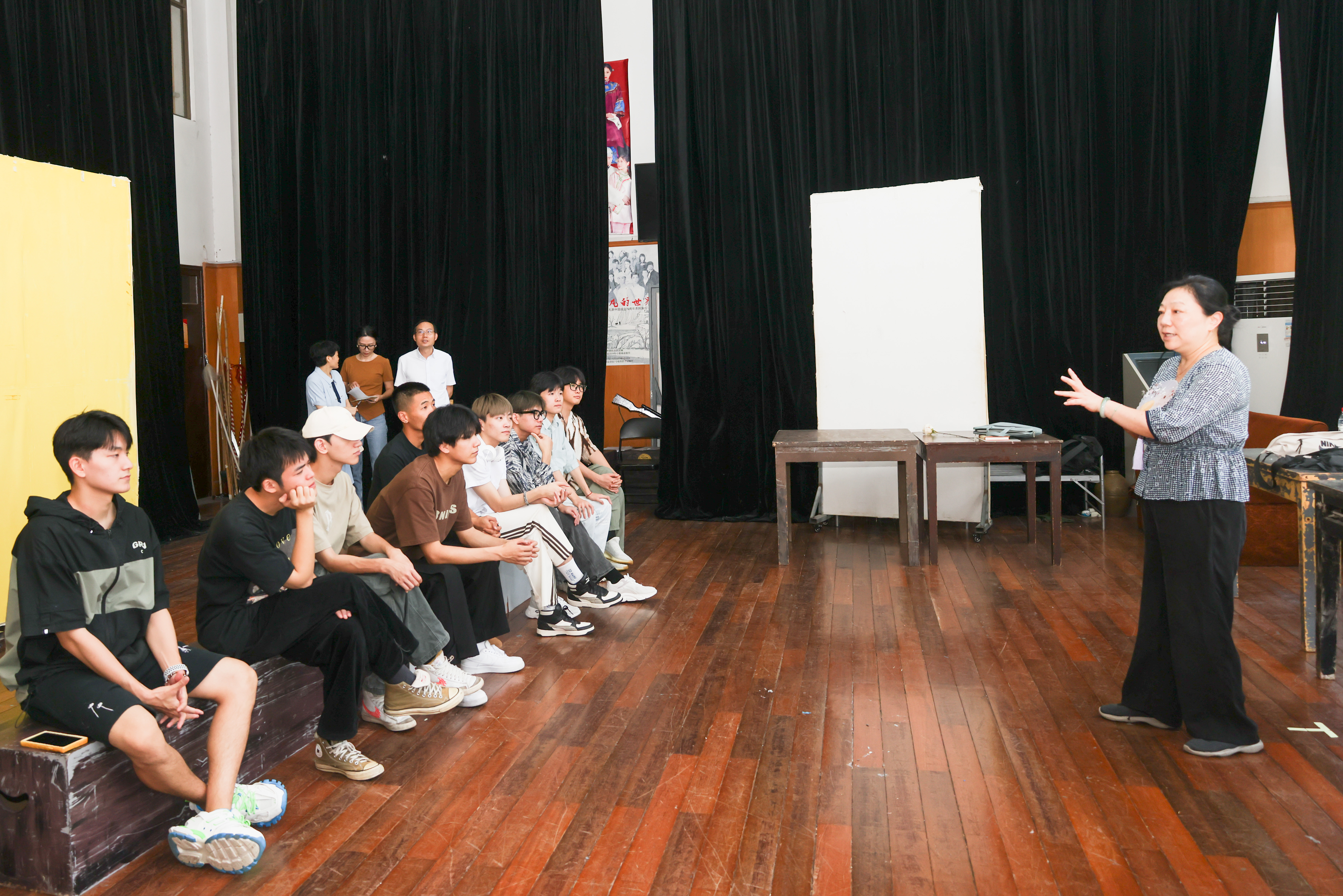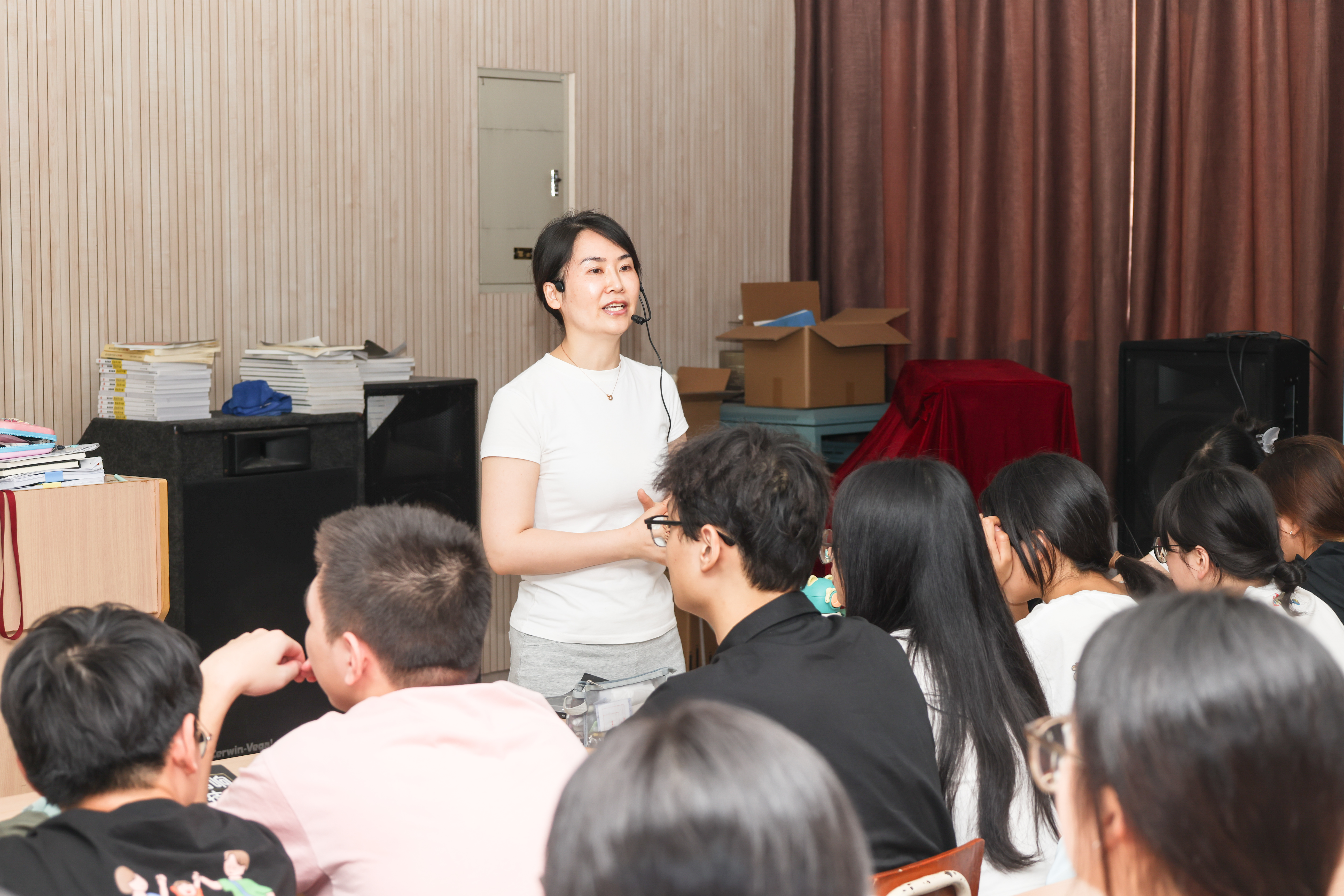 设计学院教师江腾皓面向2021级舞美专业(音响方向)学生所教授的课程是《音响实践与操作》,由于是小班课,学生数量少,学生围成一圈,耐心听老师讲解。江腾皓在课堂上作示范,利用音响发出的不同声音告诉学生如何辨别,讲解细致入微,学生认真做笔记。