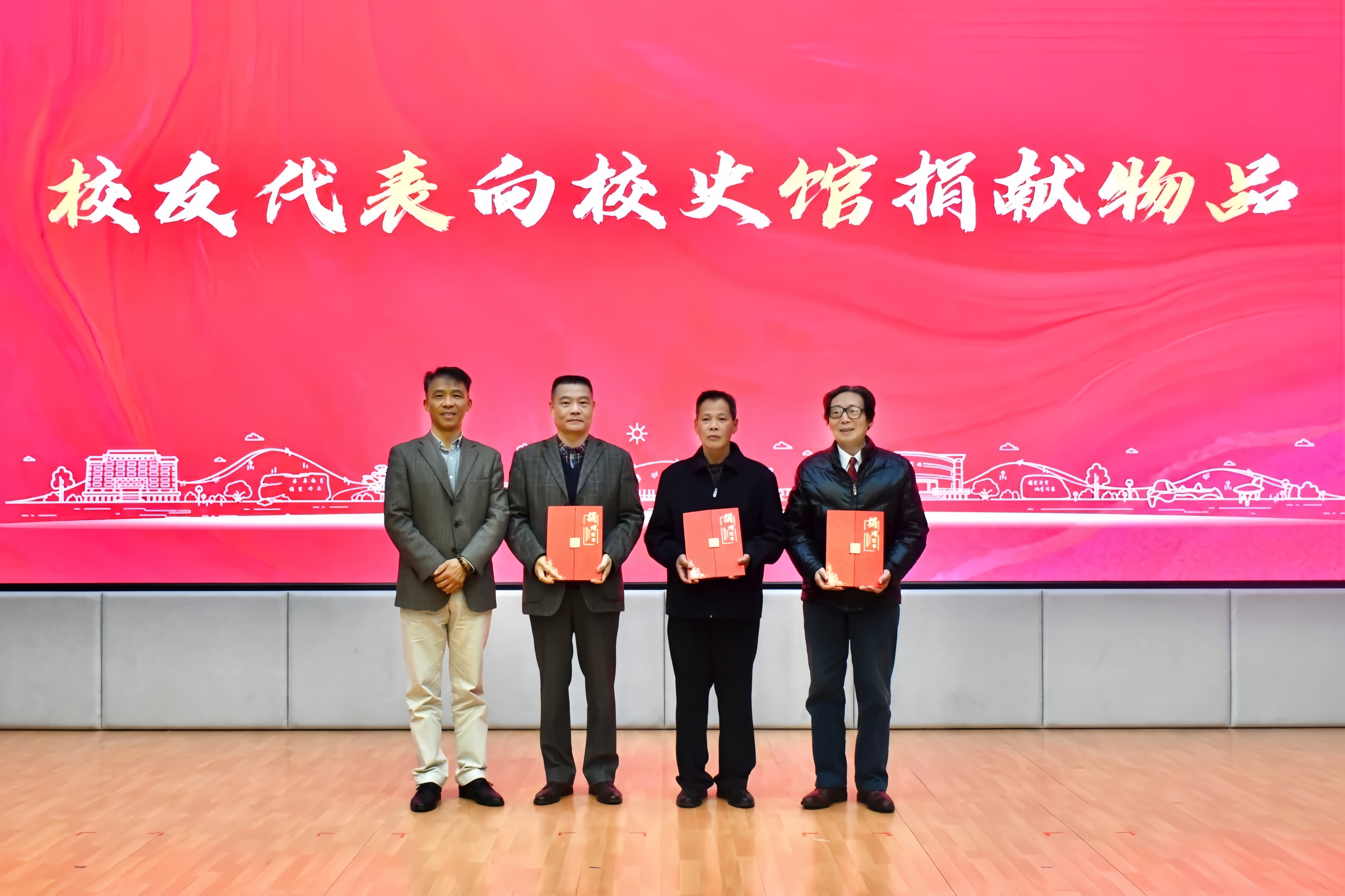 校友代表陈正良、赵雪海、王水法为支持学校校史馆建设捐赠毕业证书、图文资料等物品。沈军甫为捐赠校友代表颁发证书。