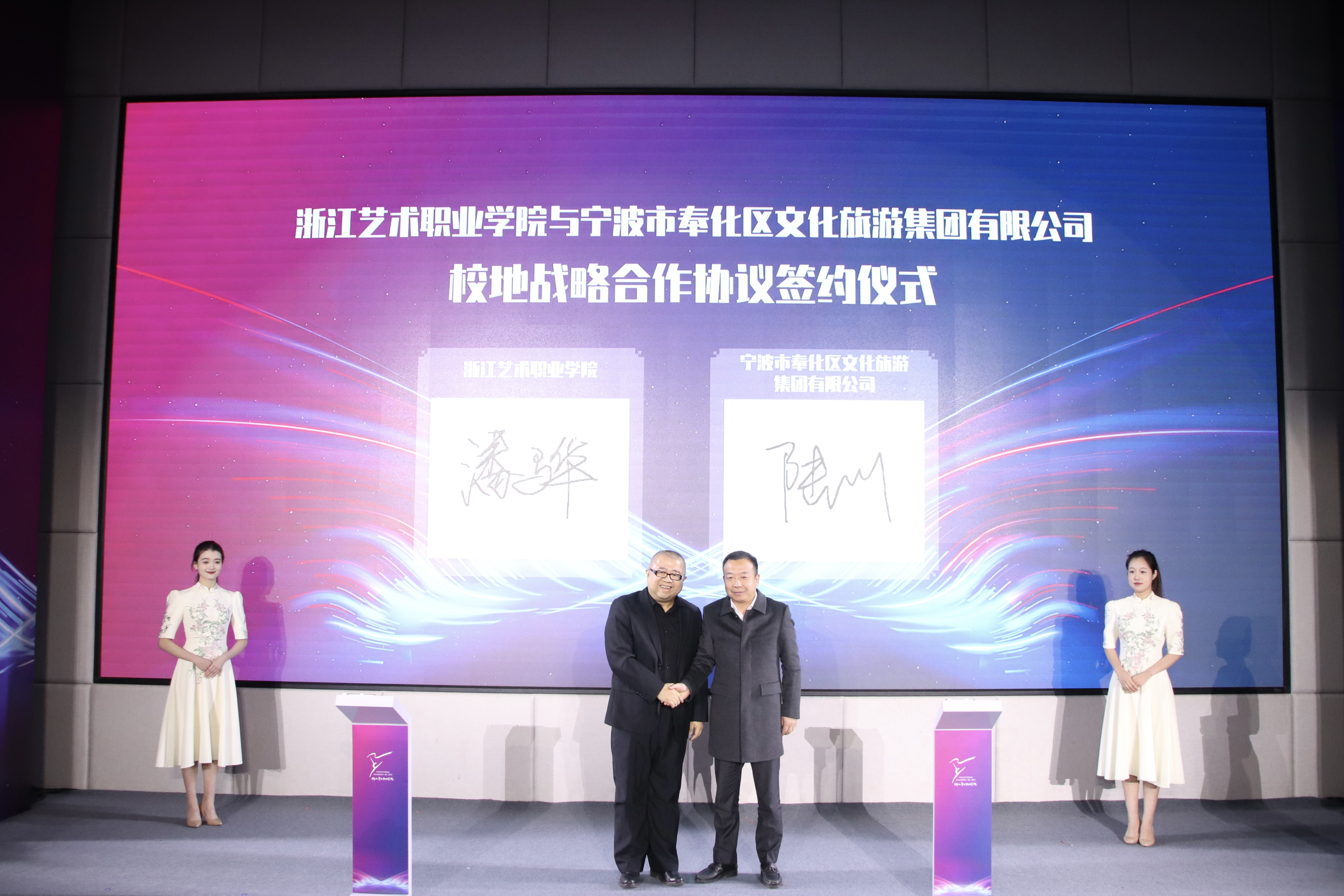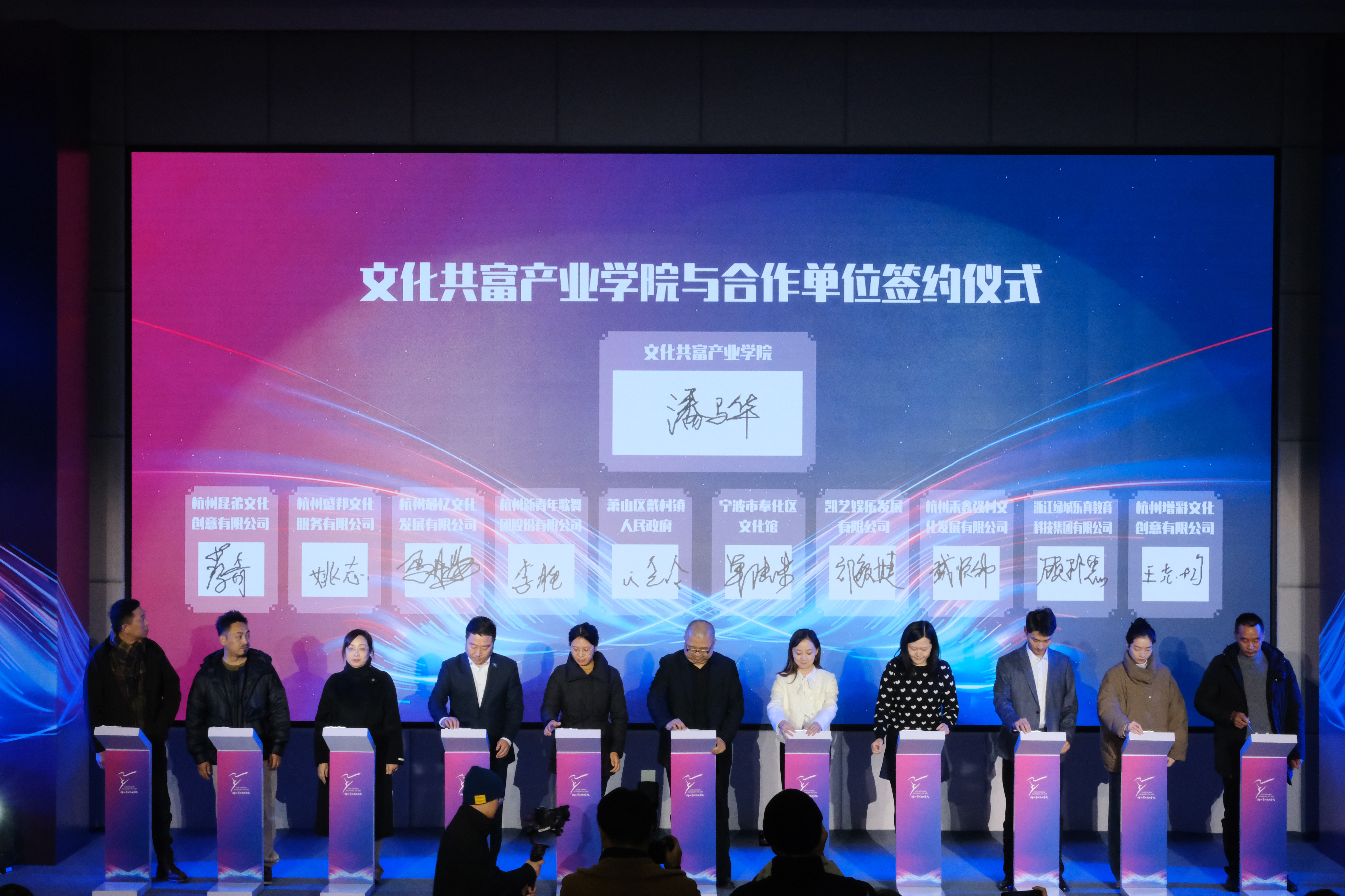 浙艺演艺与教育学院院长潘骅与文化共富产业学院十家共建单位代表签署合作协议。
