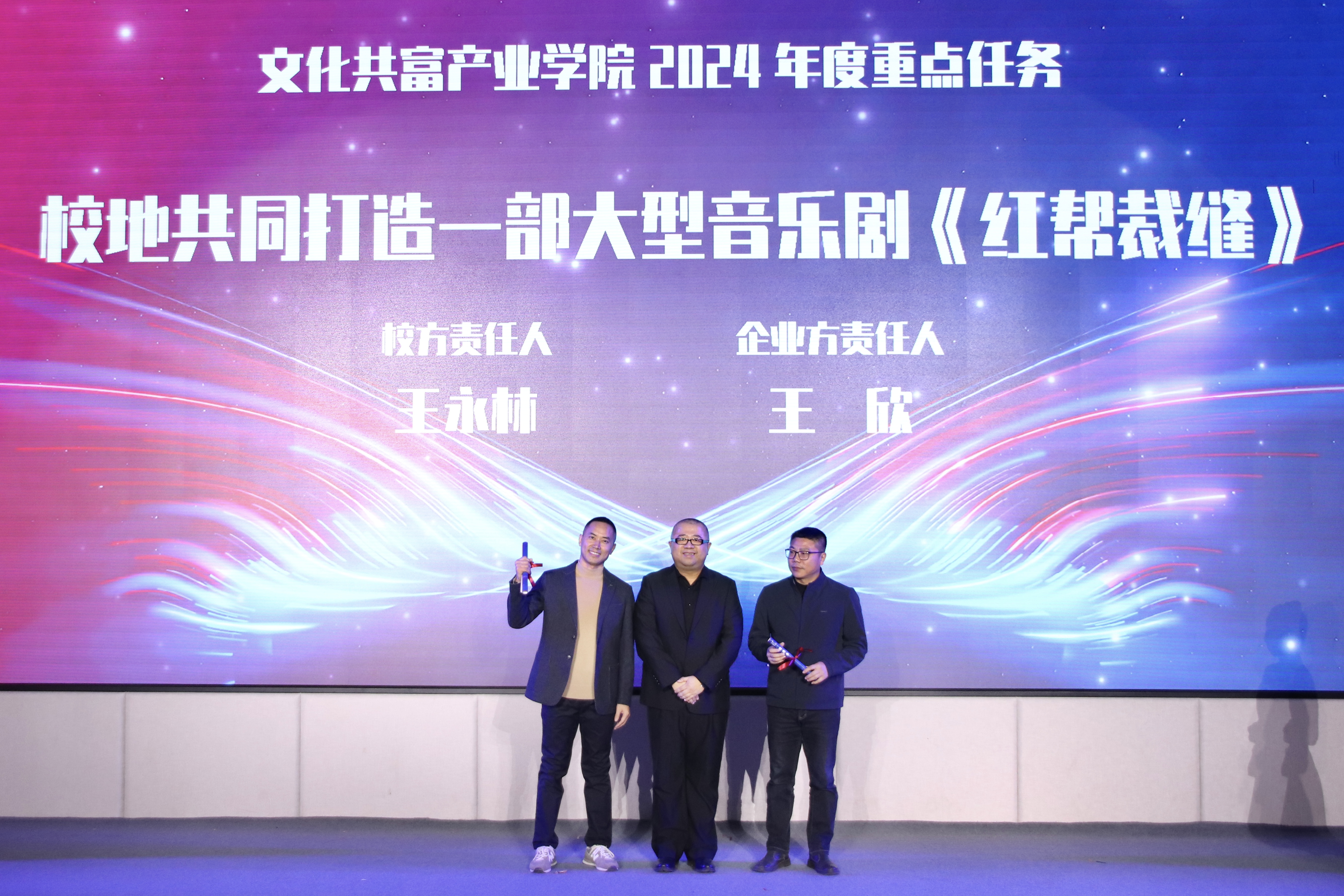 浙江艺术职业学院院长施俊天与杭州新青年歌舞团股份有限公司董事长张钎共同为文化共富产业学院揭牌。现场发布了文化共富产业学院2024年度九大工作任务,校企责任方共同上台领取责任书。