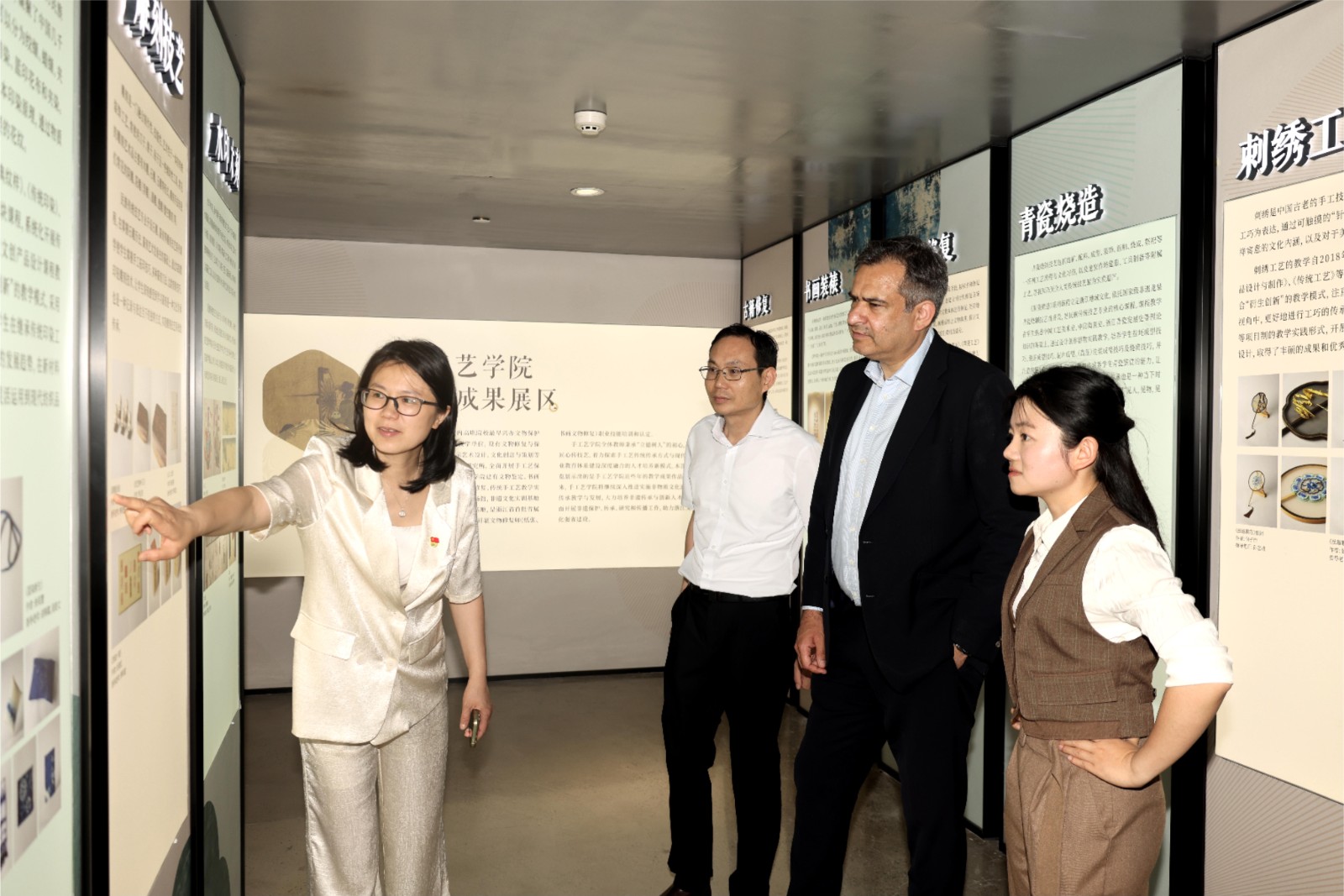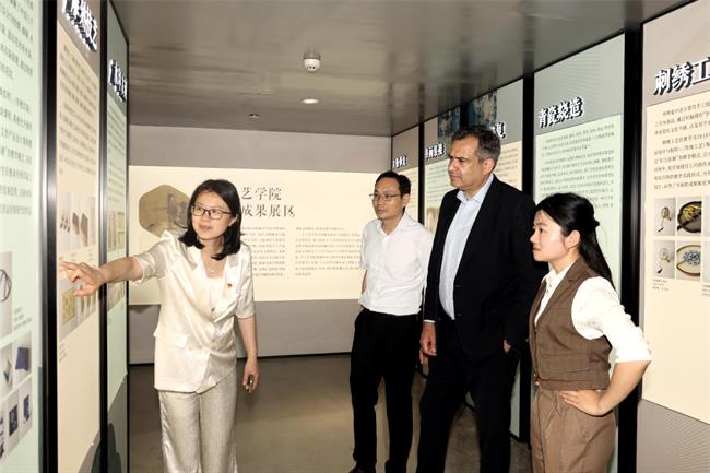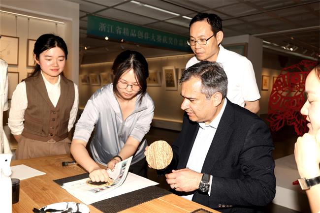 施睿耀一行还参观了设计学院、手工艺学院的教学场地和实训场所,观看了由浙江非遗传习院和手工艺学院共同举办的“匠心守艺”非遗创意作品展,亲自体验了水印木刻,对我校深厚的办学底蕴与近年高速发展有了更直观的了解,为双方进一步合作奠定了基础。