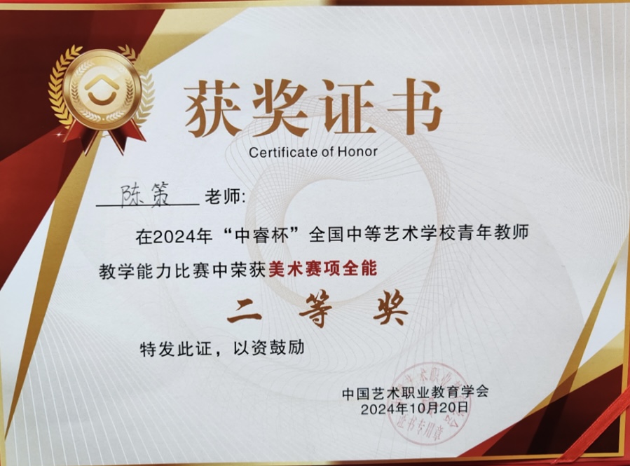 近日,由中国职业教育学会主办,中国艺术职业教育学会中等艺术职业学校工作委员会、重庆艺术学校承办的2024年“中睿杯”全国中等艺术学校青年教师教学能力比赛现场决赛(声乐、美术赛项)在重庆艺术学校举行。经过角逐,我校设计学院青年教师陈策斩获美术赛项专业(技能)一等奖、全能二等奖。