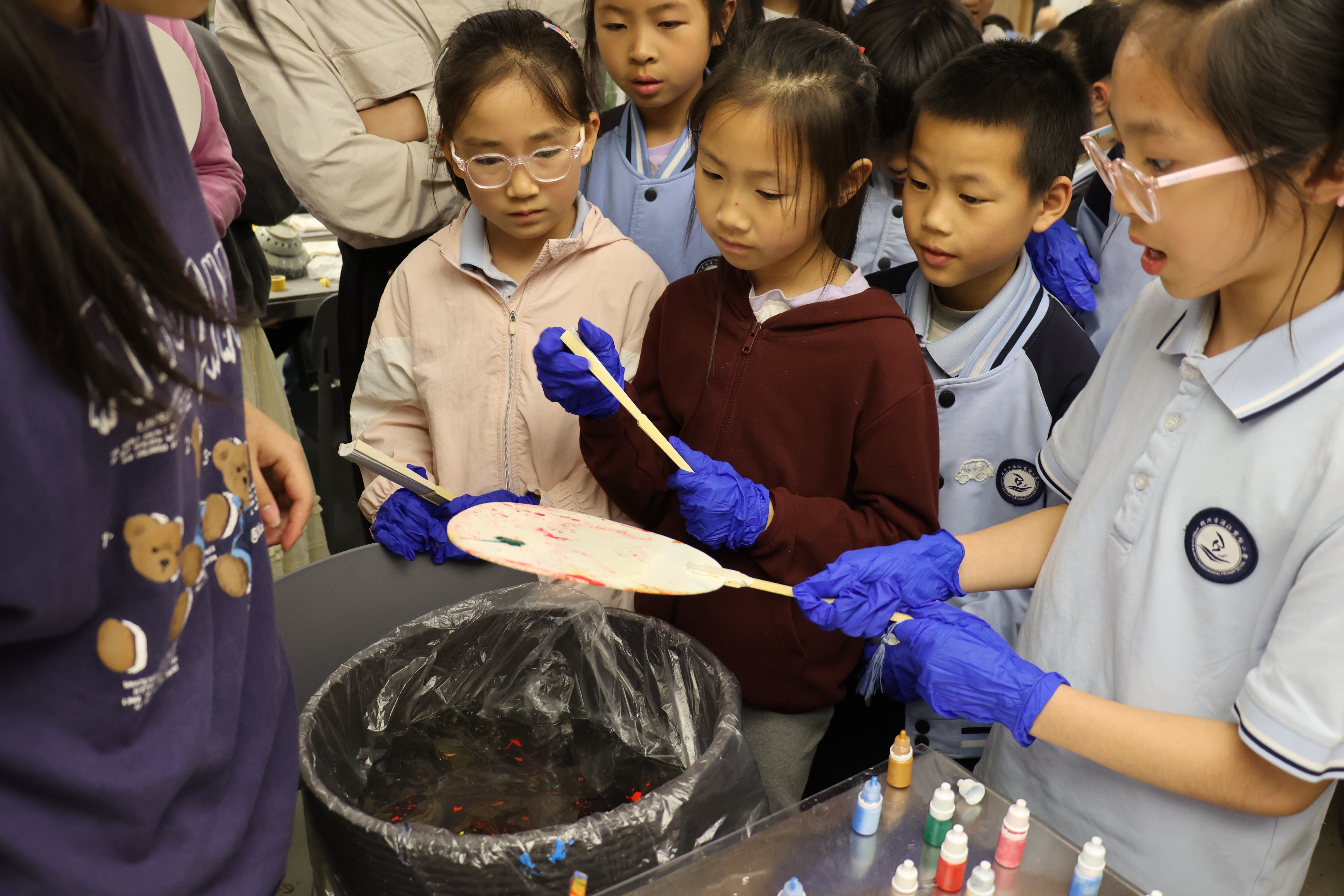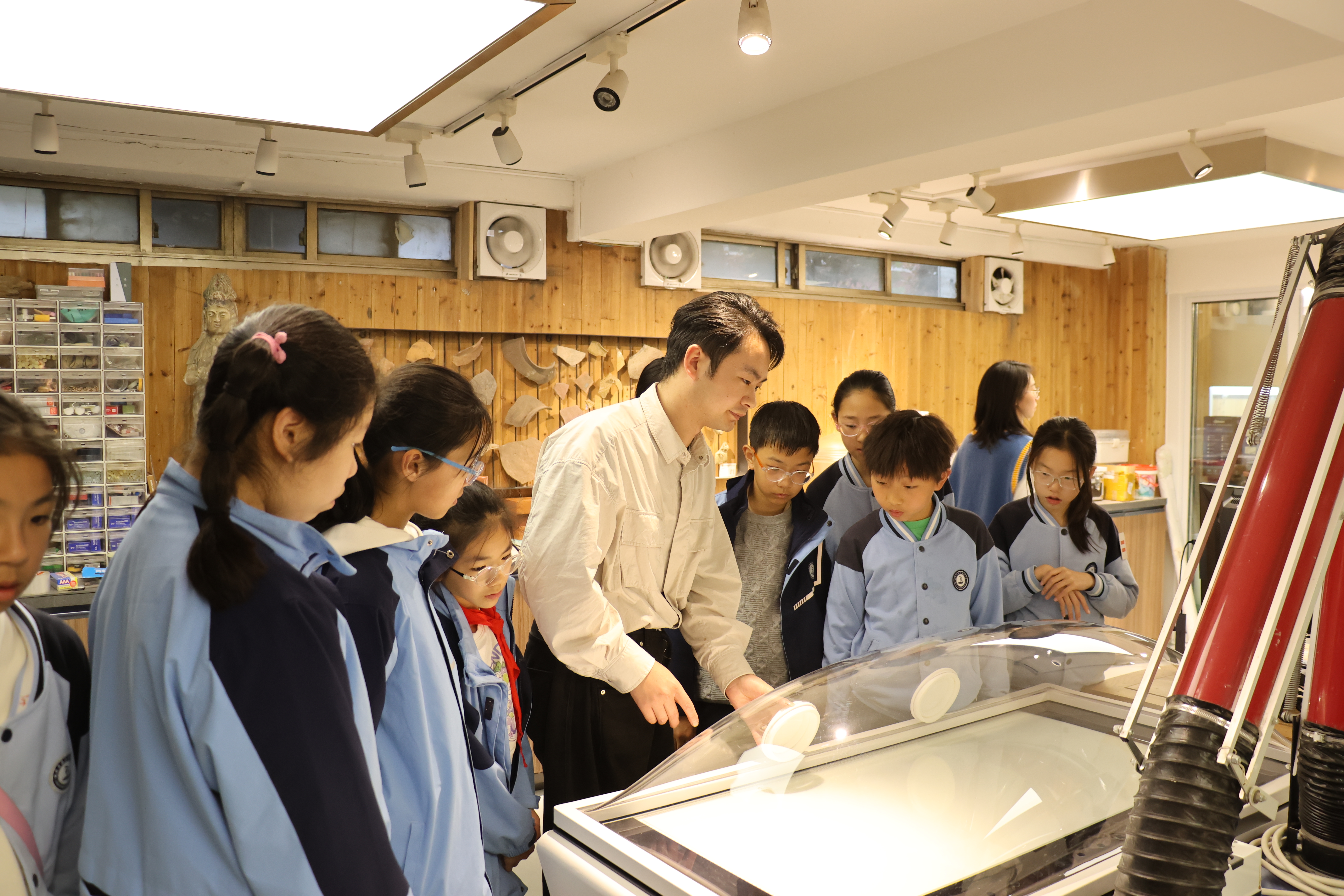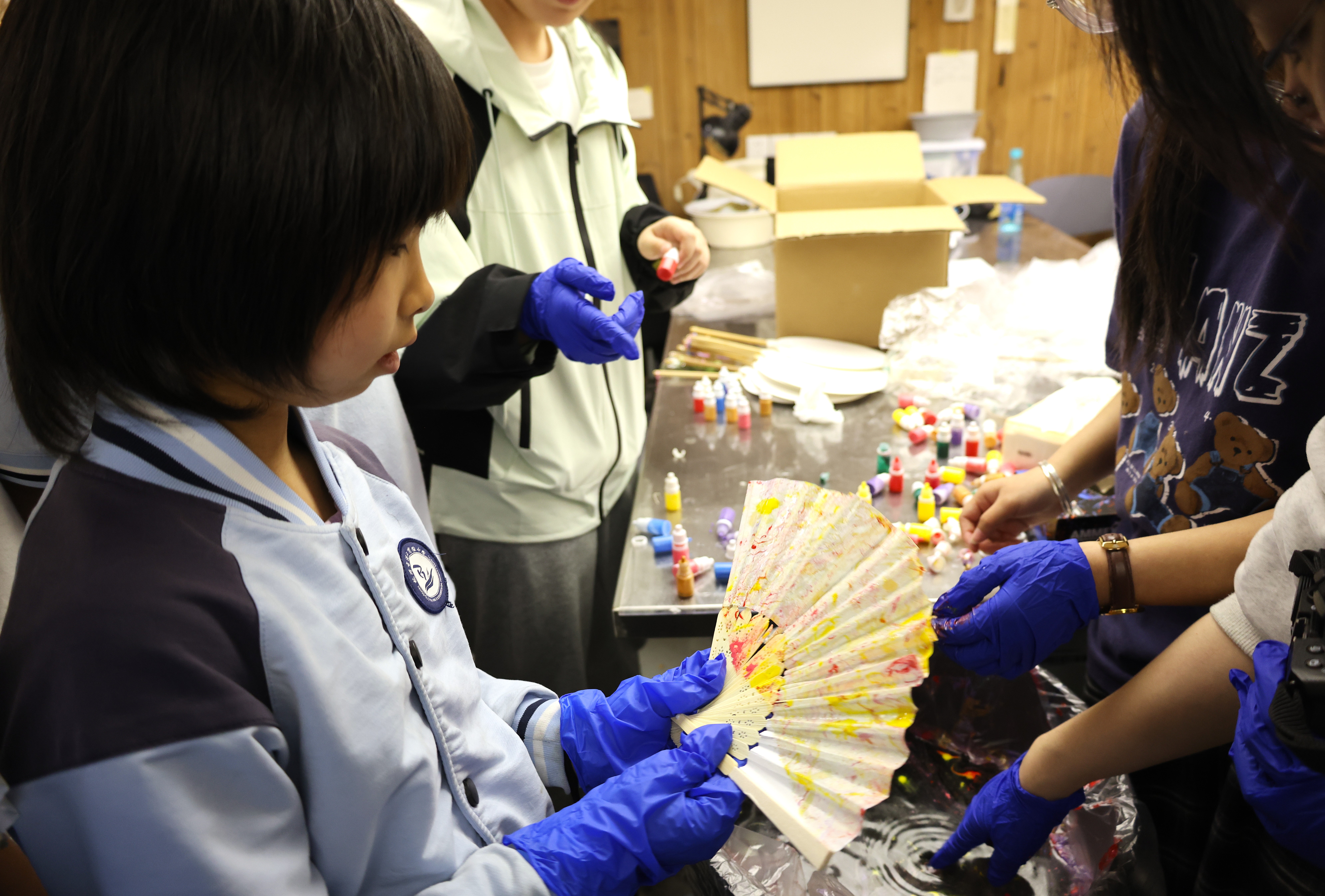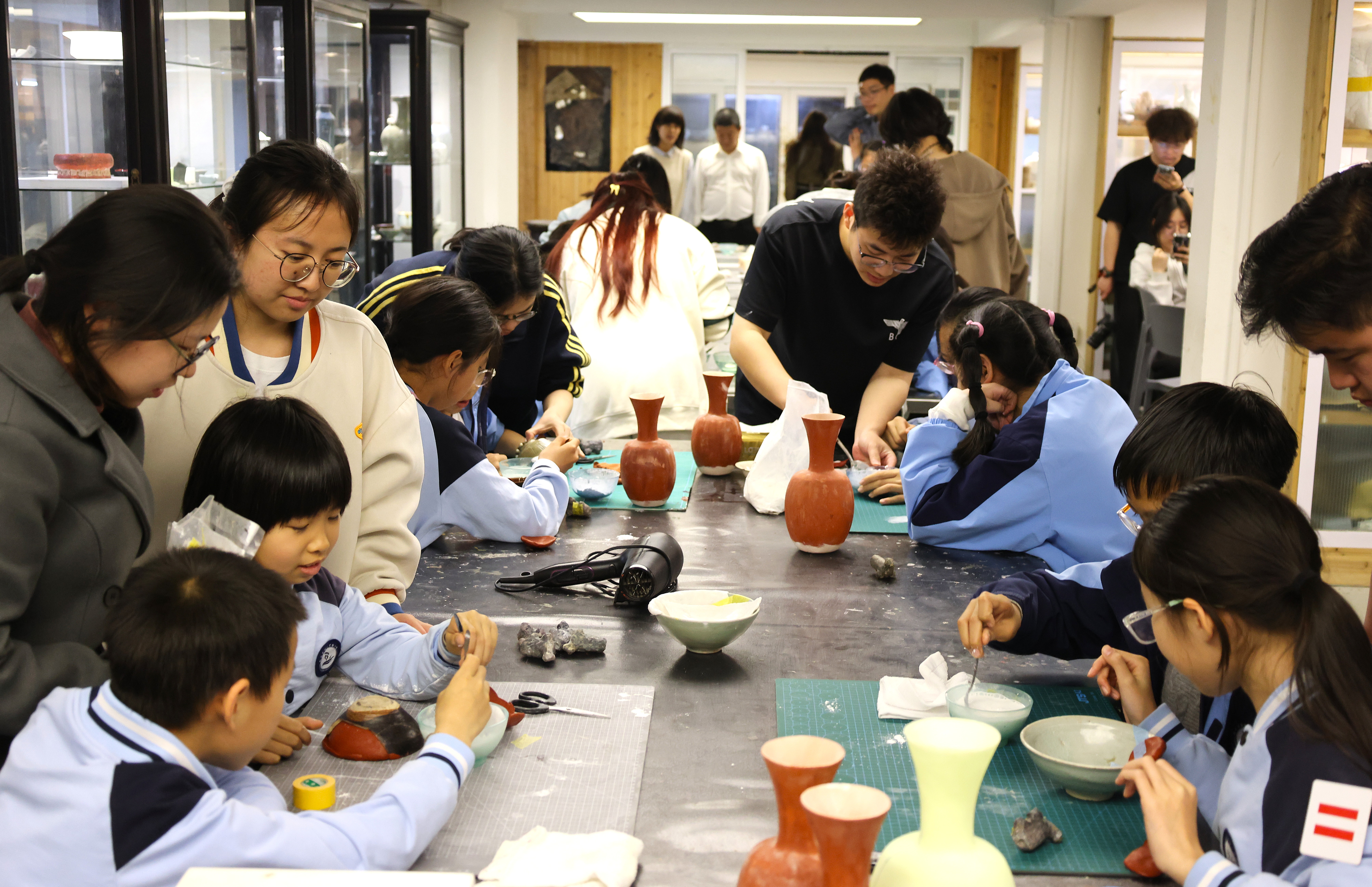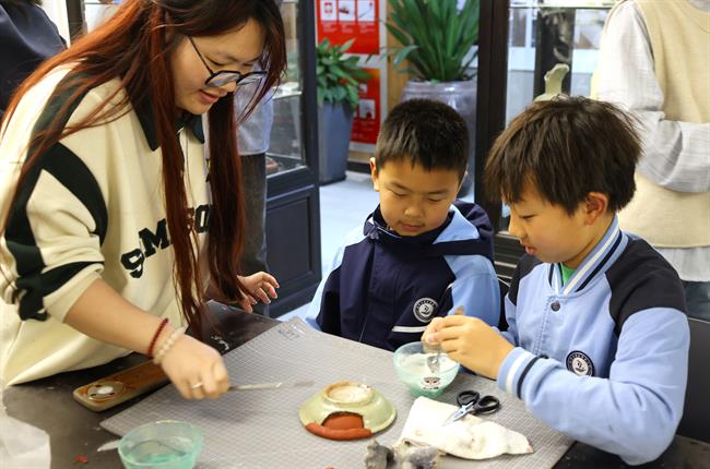 活动期间,朱伟洁、徐佳颖两位老师带领同学们参观了古陶瓷修复实训室。同学们亲自动手参与了器物补缺实践活动和漆扇制作体验,充分感受传统手工艺的独特魅力。