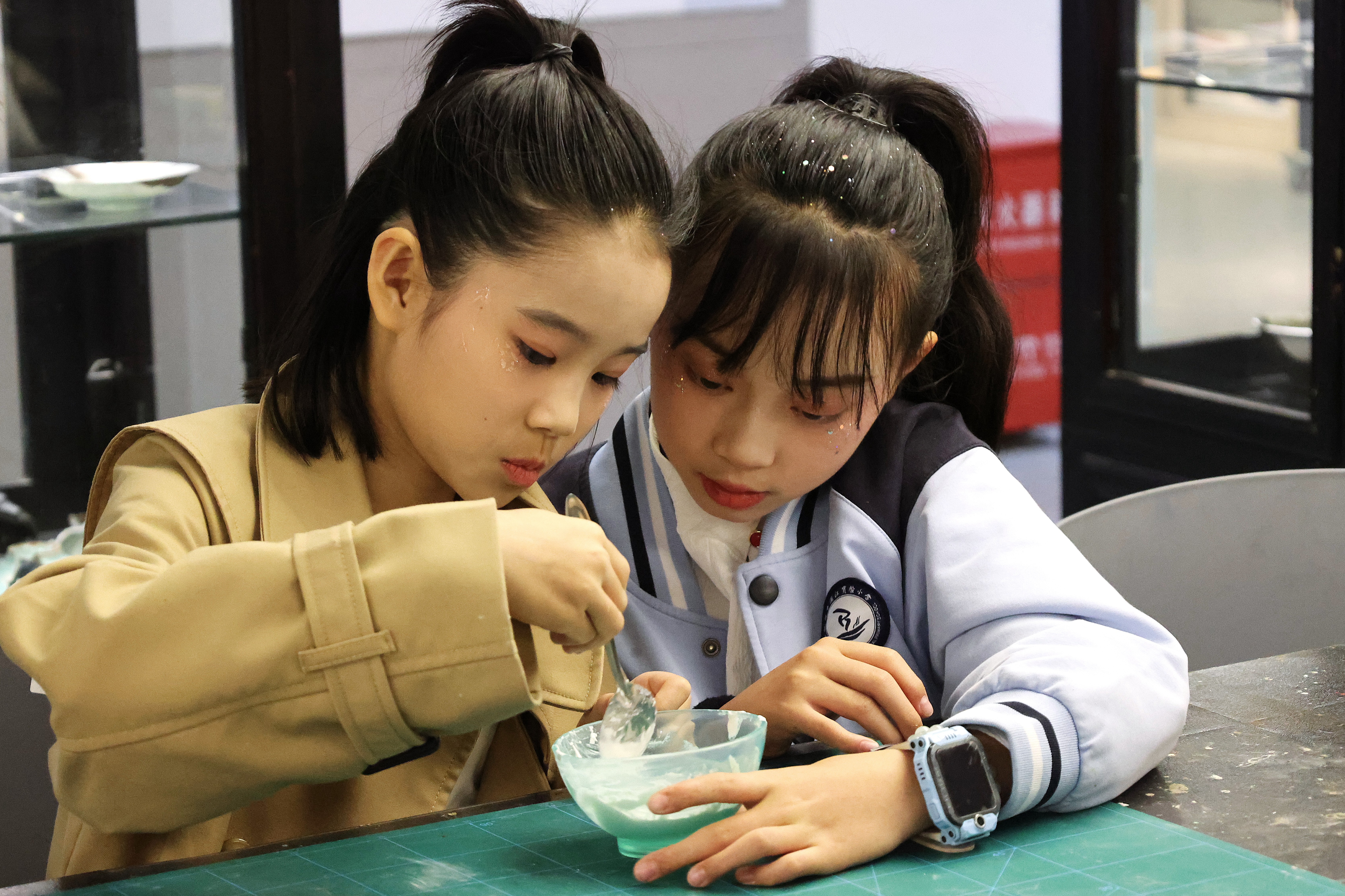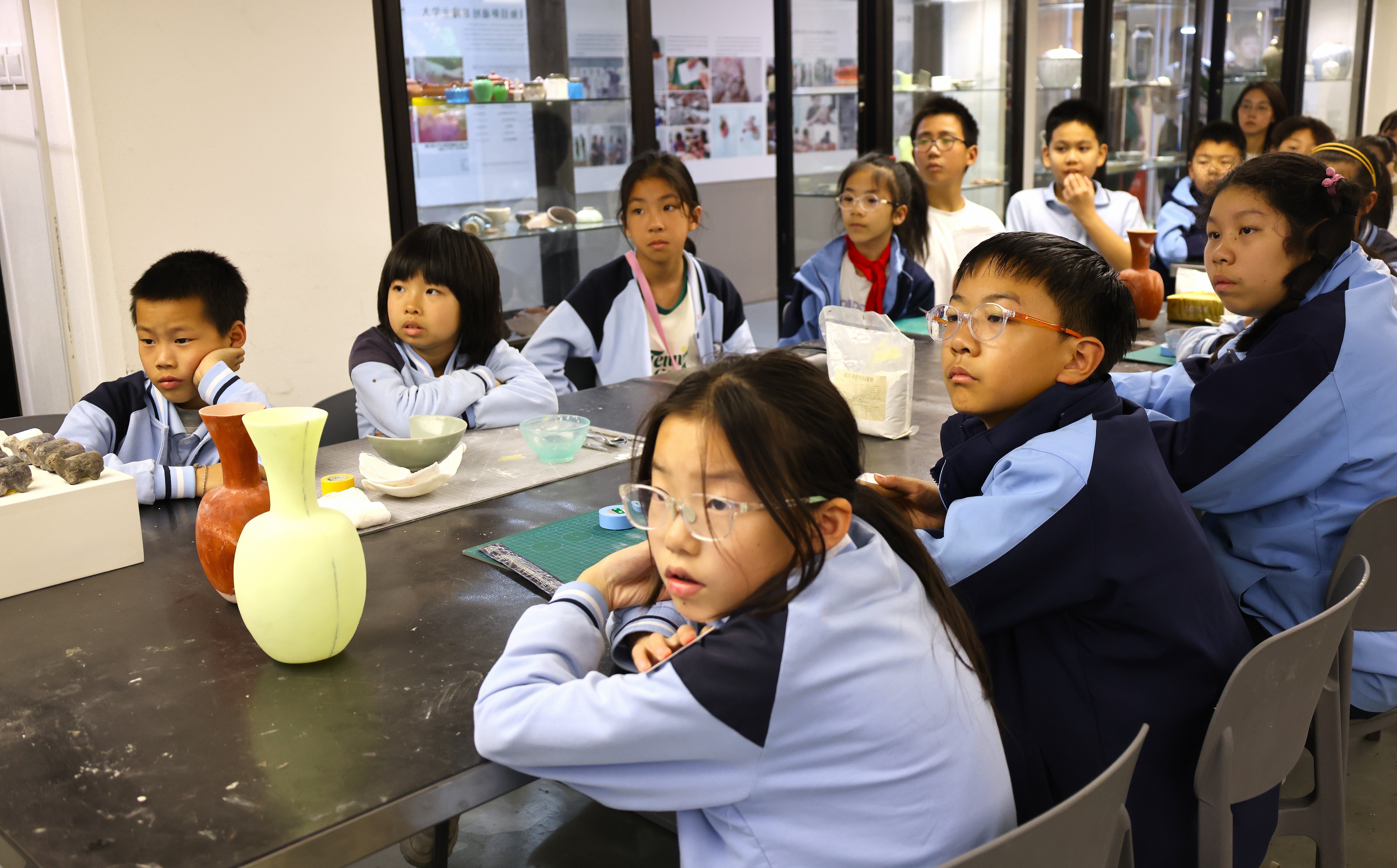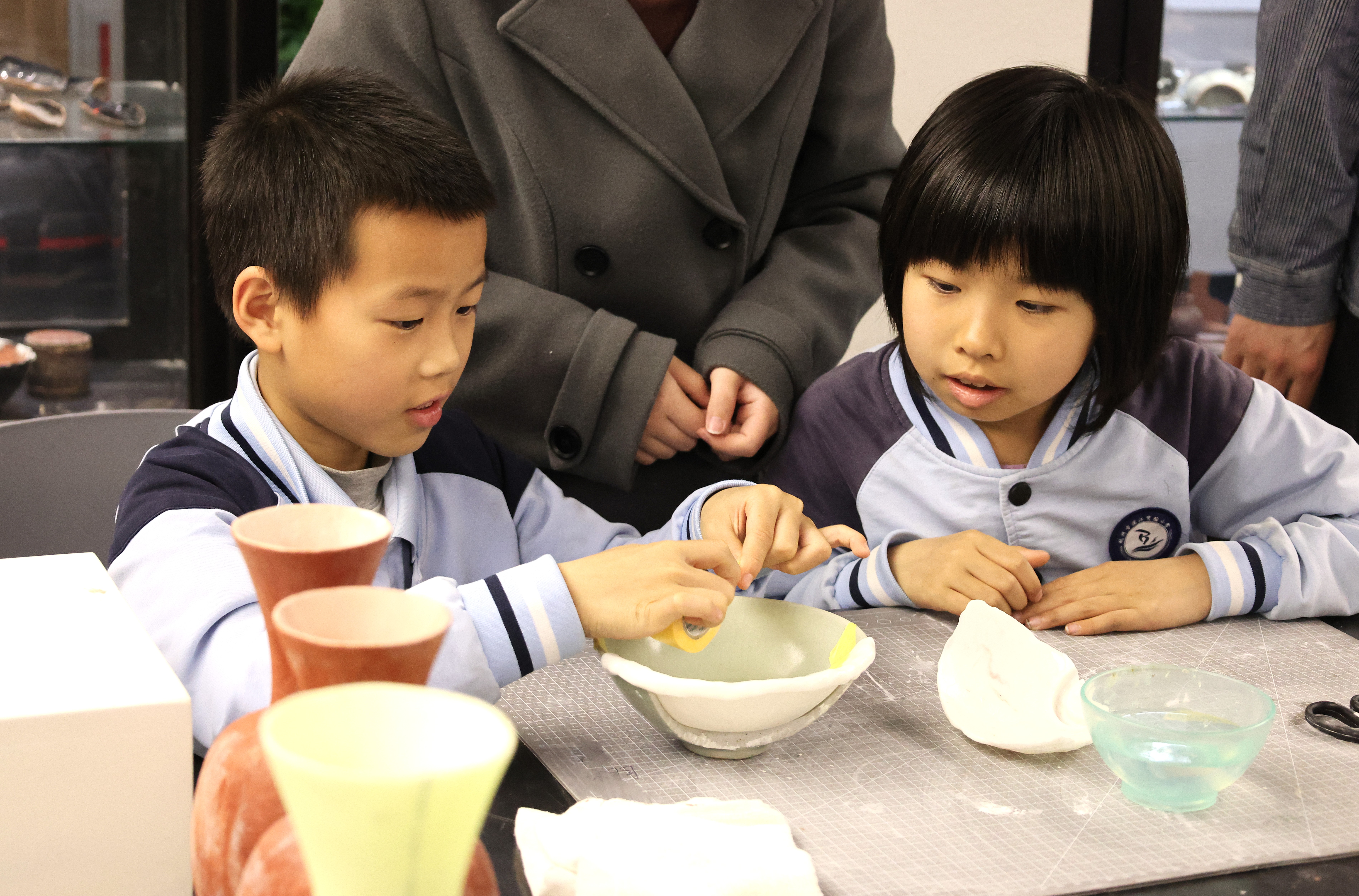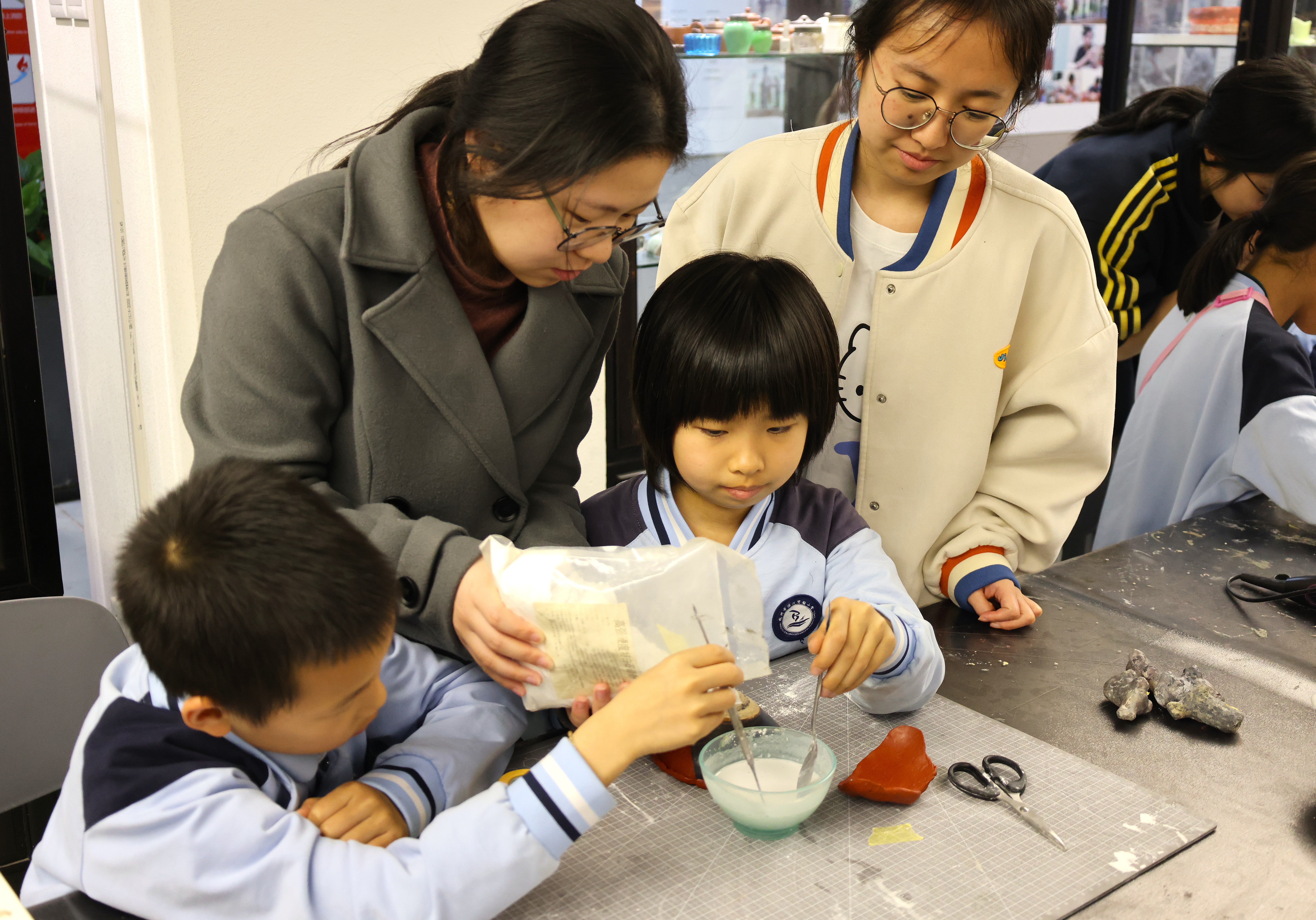 活动期间,朱伟洁、徐佳颖两位老师带领同学们参观了古陶瓷修复实训室。同学们亲自动手参与了器物补缺实践活动和漆扇制作体验,充分感受传统手工艺的独特魅力。