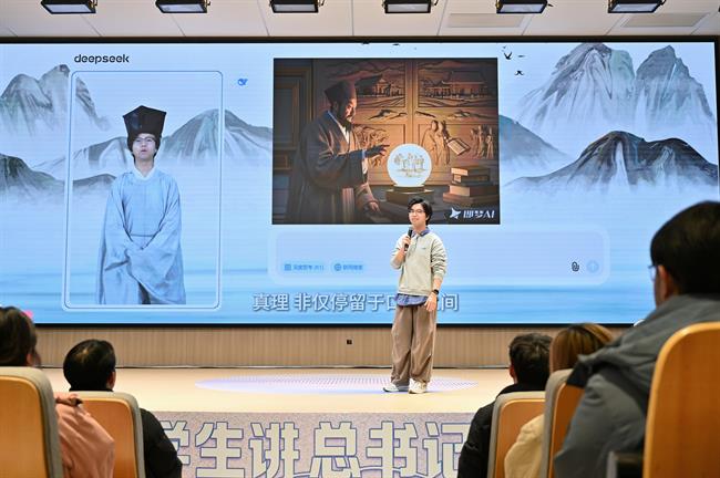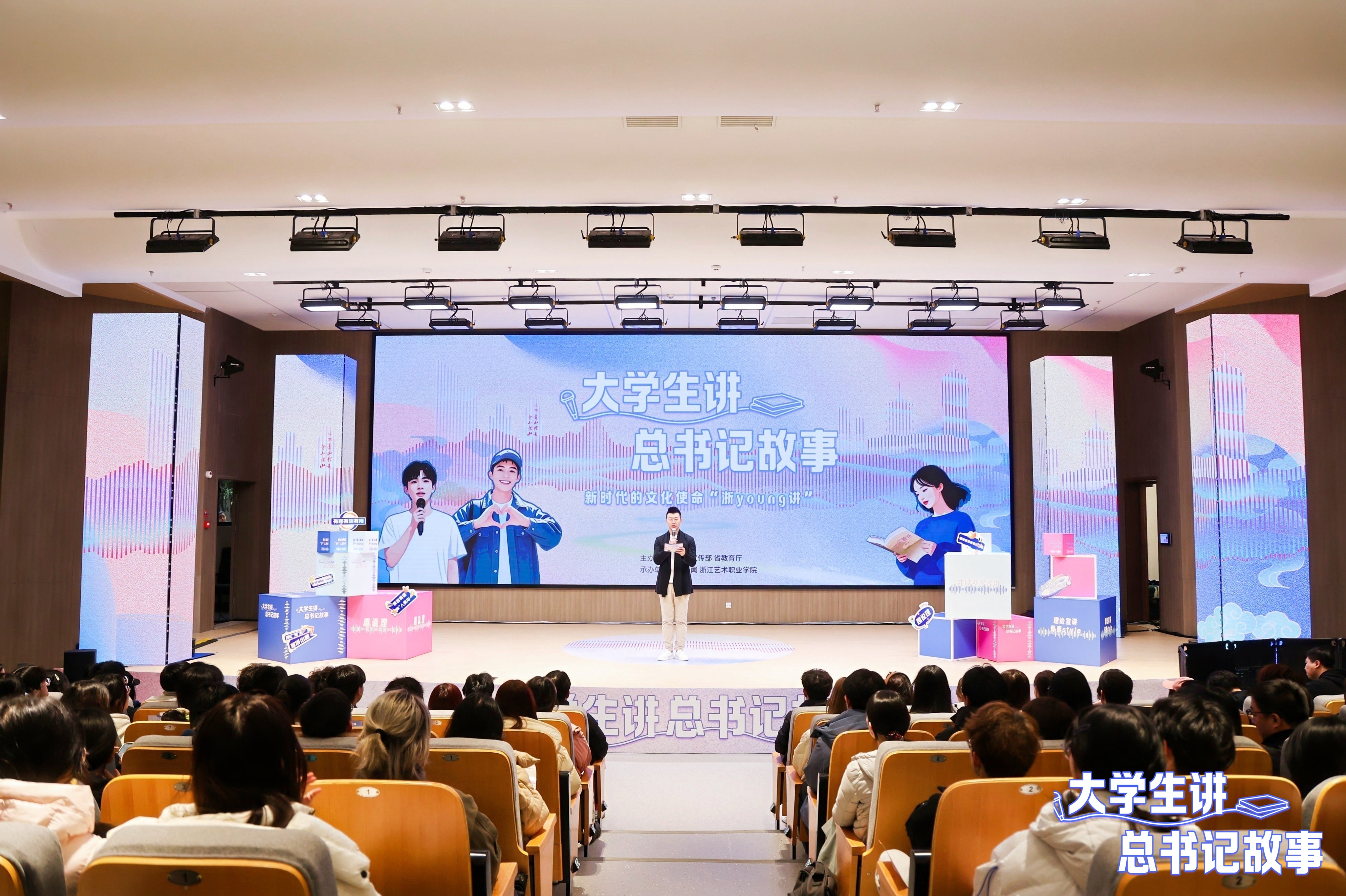 3月5日下午,“大学生讲总书记故事”系列活动在浙江艺术职业学院举办。作为系列活动的首场,活动聚焦新时代的文化使命这一主题,由来自浙江大学、浙江工业大学和杭州师范大学等高校的6组宣讲员用开放麦、情景剧、AI互动等年轻人喜闻乐见的方式,以满满“青春味”和“科技味”的表达,为全校近300名师生上了一堂别开生面的“思政课”。