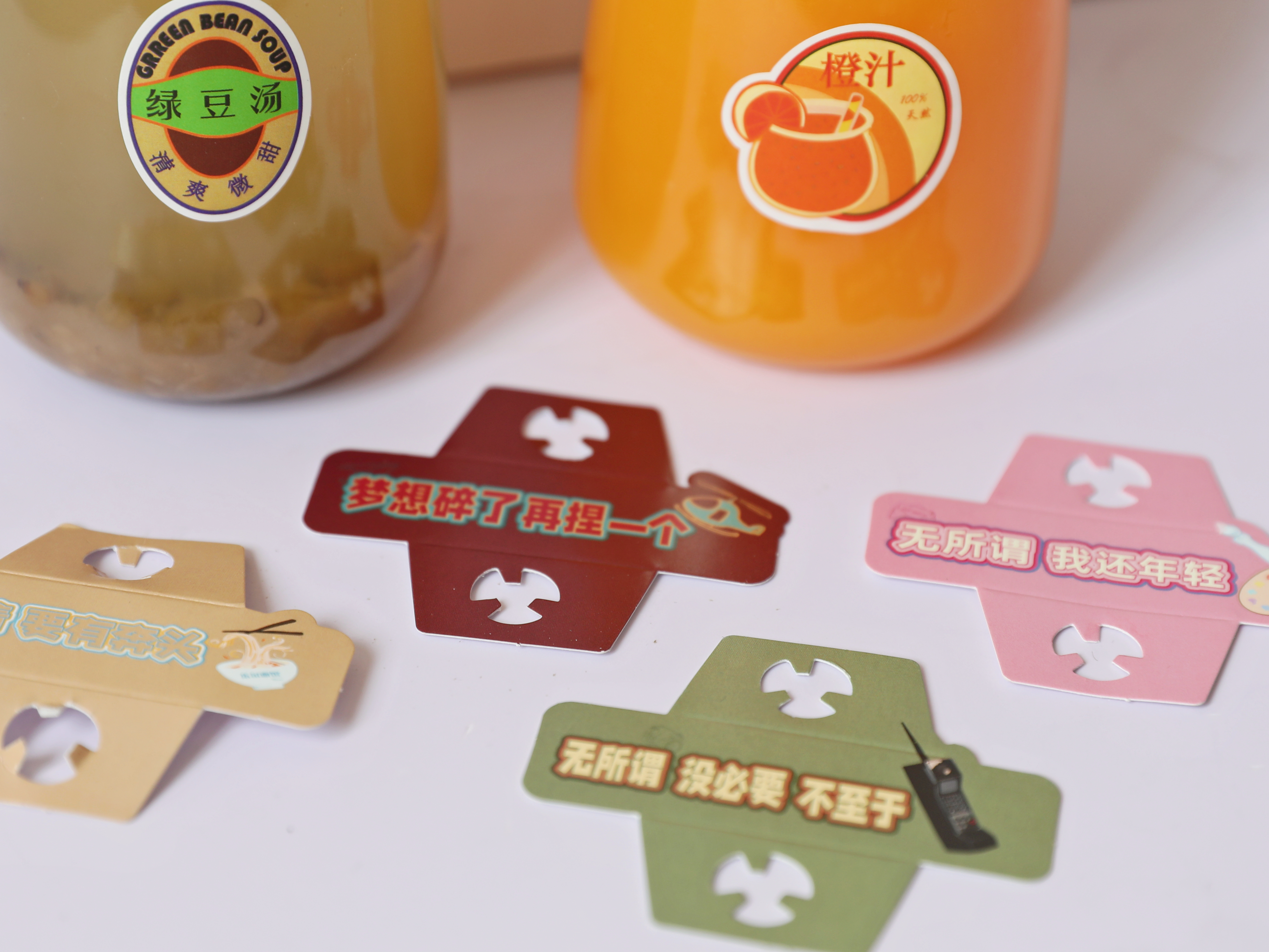 橙汁贴纸以橙子为视觉中心,结合瓶身的形状,转化为异形的形式,运用不同色调的橙、黄色混合,丰富层次感,体现其新鲜多汁。外圈还添加复古绿作为装饰点缀,增添复古感。绿豆汤贴纸以90年代夏日消暑为灵感,主打怀旧童年时光,富有生活化趣味。配色采用复古的红蓝绿为主色,辅以亮橙和浅黄。字体使用简易加粗字体,“绿豆汤”主体位于中间,下方体现绿豆汤“清爽微甜”的特点。