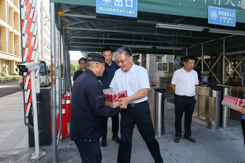8月13日下午,党委书记薛亮带队开展走访慰问校园各岗位,看望暑期坚守工作的施工人员、后勤保障、安保人员,对他们顶着高温维护校园环境、保障设施运行的付出表示感谢,并叮嘱大家做好防暑降温,确保自身安全与工作质量。将关怀送到教职工的“心坎上”。