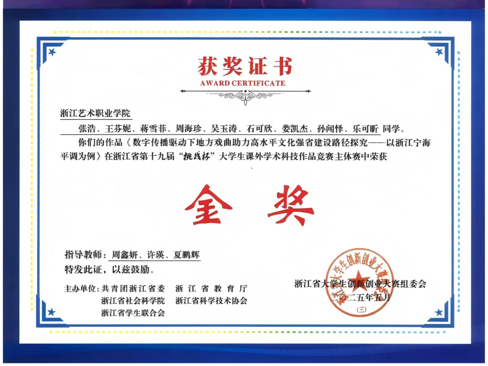 着力培育艺术创新与技术实践兼备、德艺双馨的高素质复合型人才。近年来,学院师生在全国大学生广告创意设计竞赛、全国中华经典诵写讲大赛等国家级、省级各类专业竞赛中累计获奖500余项,连续三届获全国大学生艺术节获一等奖,在浙江省大学生国际创新大赛、“挑战杯”、职业生涯规划大赛中获金奖3项、银奖3项、铜奖10项。构建“课程+”“文化+”“管理+”“服务+”“实践+”五育协同育人体系,累计开展各类校园文化活动500余场,参与师生达2万人次。组建“红色轻骑兵”宣讲团,在校园内外开展巡回宣讲百余场,推动党的创新理论入脑入心。