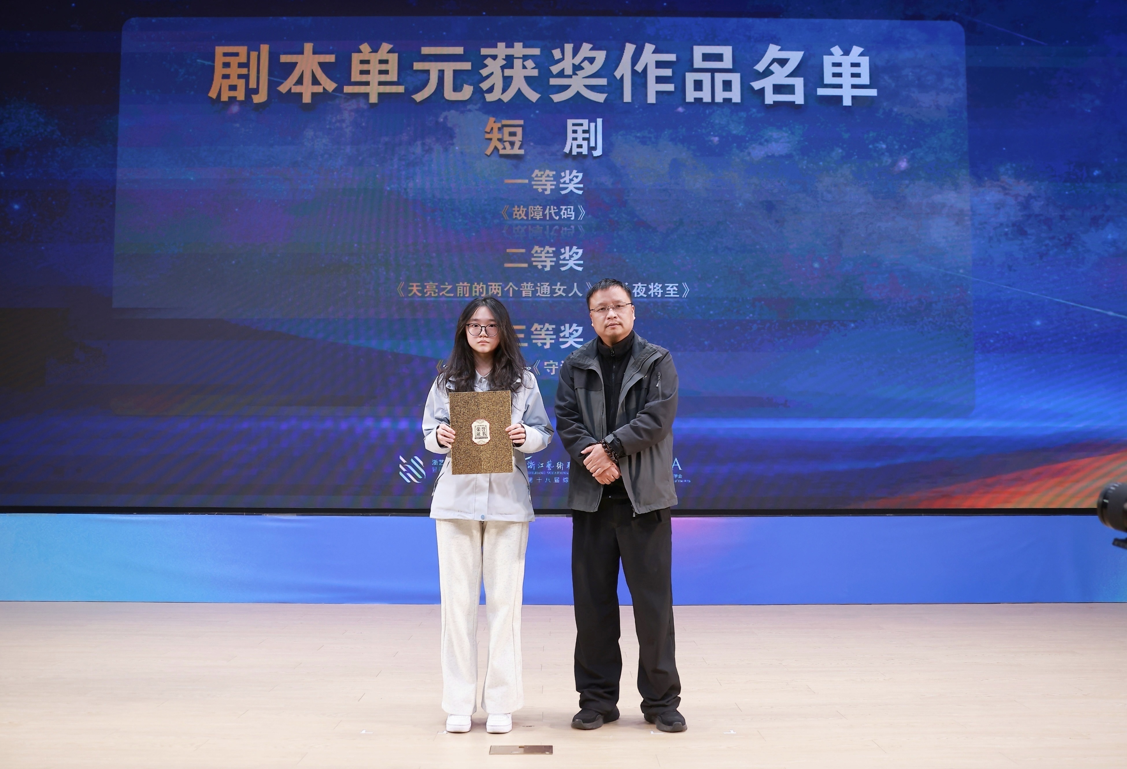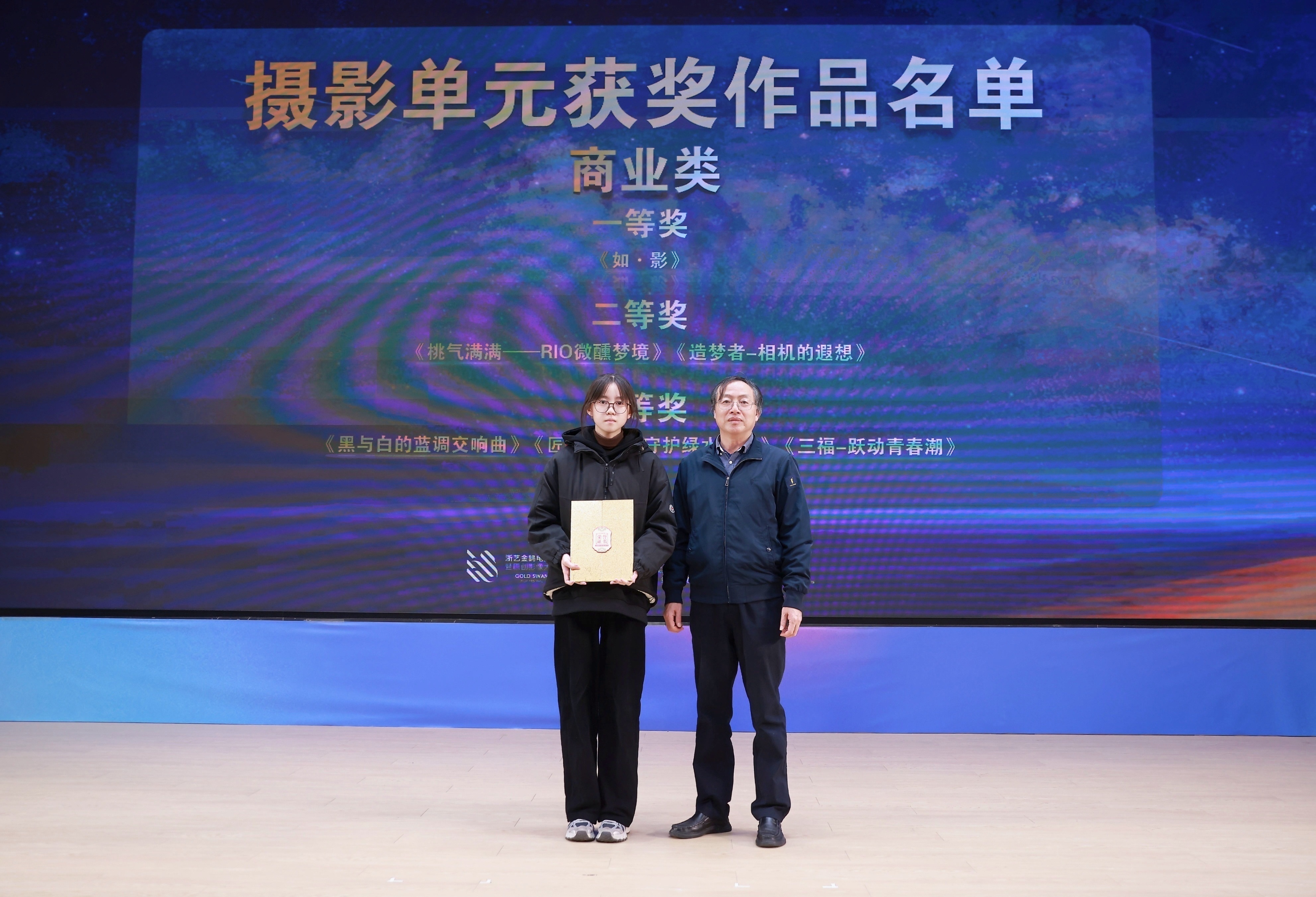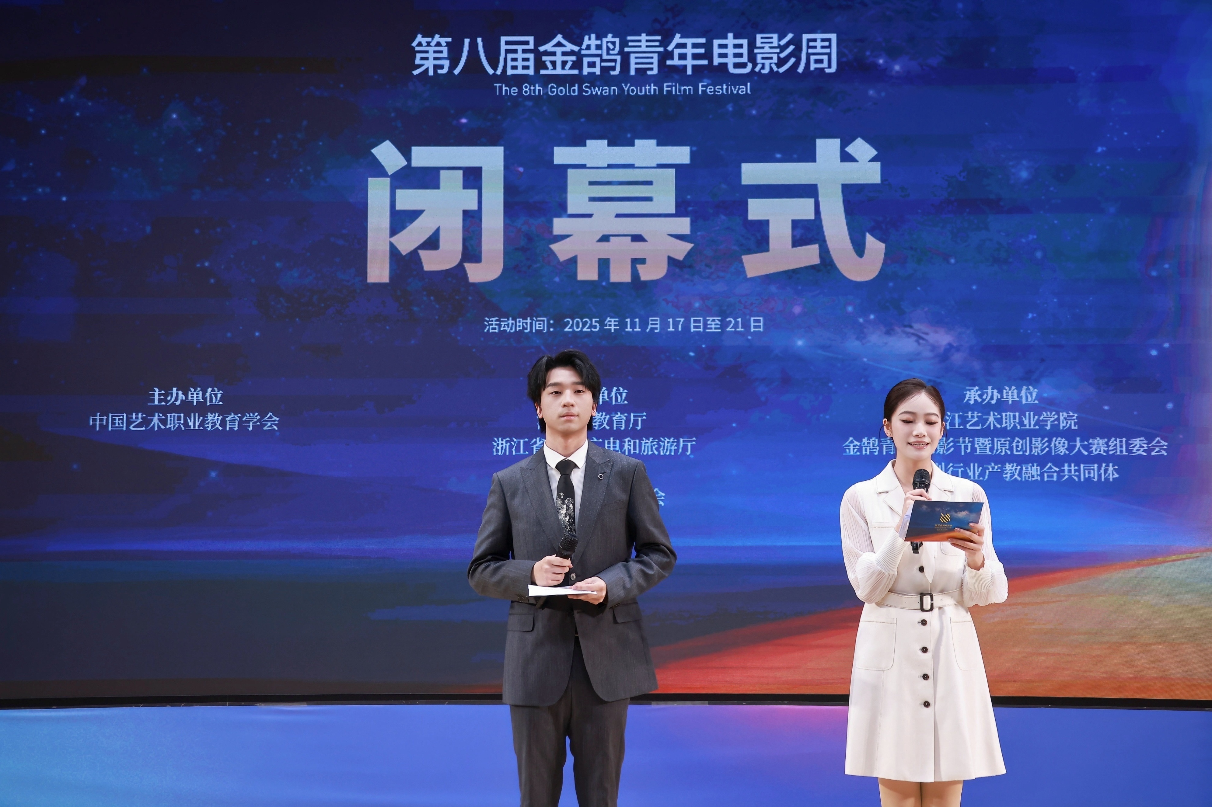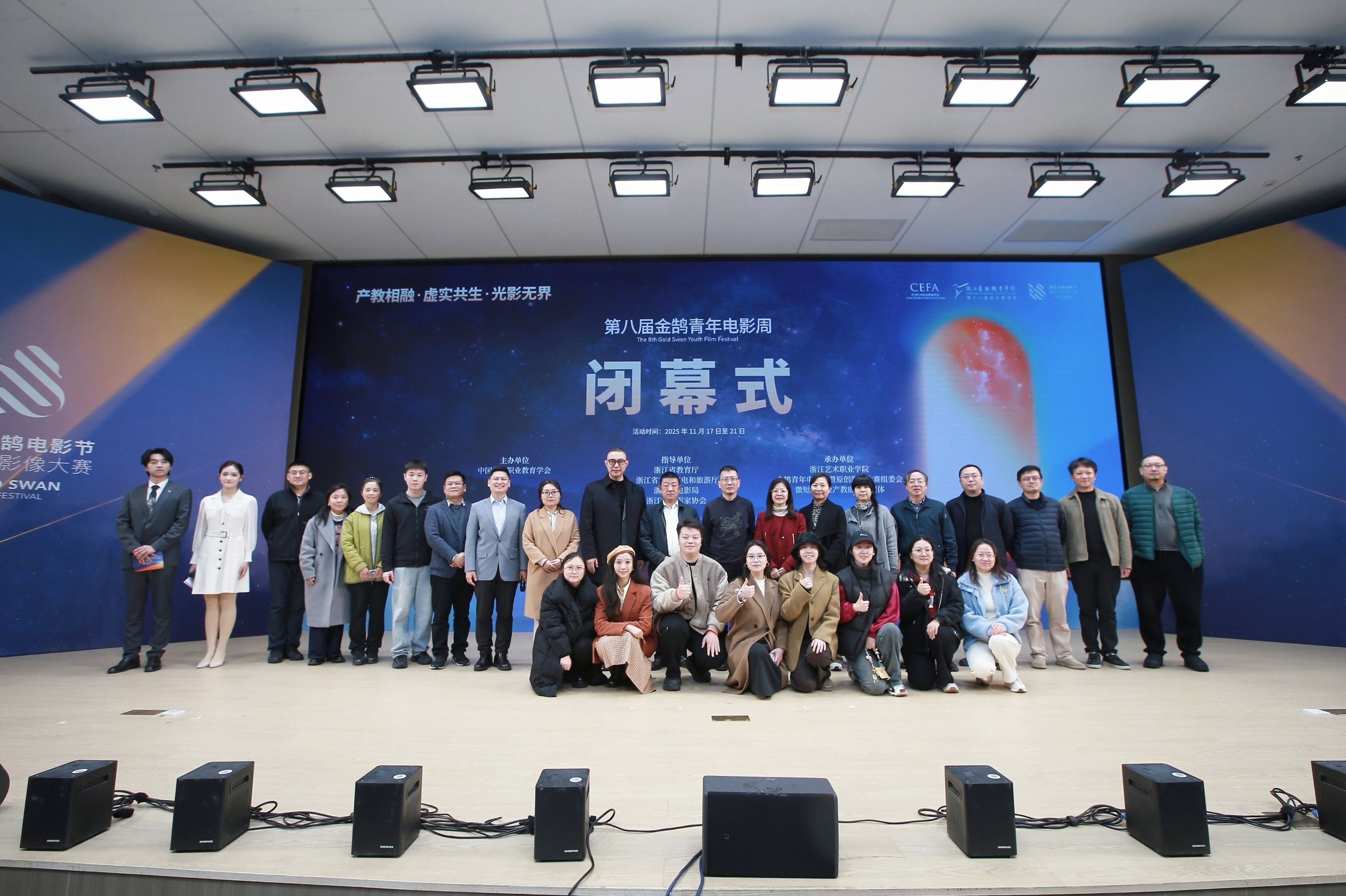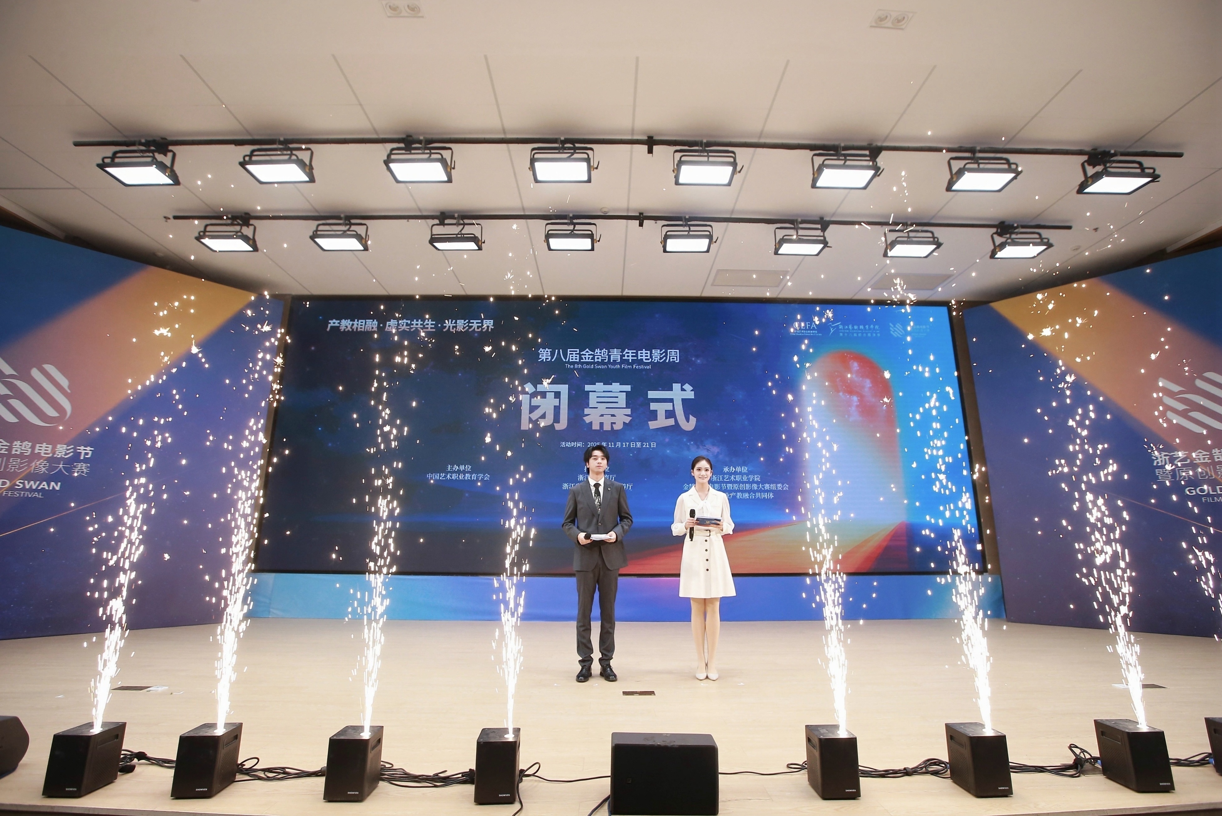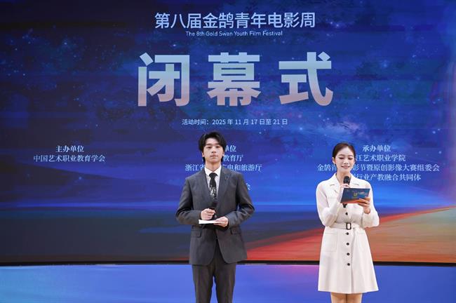 1121日晚,由浙江省教育厅、浙江省文化广电和旅游厅、浙江省电影局、浙江省电影家协会指导,中国艺术职业教育学会主办,浙江艺术职业学院、金鹄青年电影周暨原创影像大赛组委会、微短剧行业产教融合共同体联合承办的第八届金鹄青年电影周暨原创影像大赛,在浙江艺术职业学院落幕。