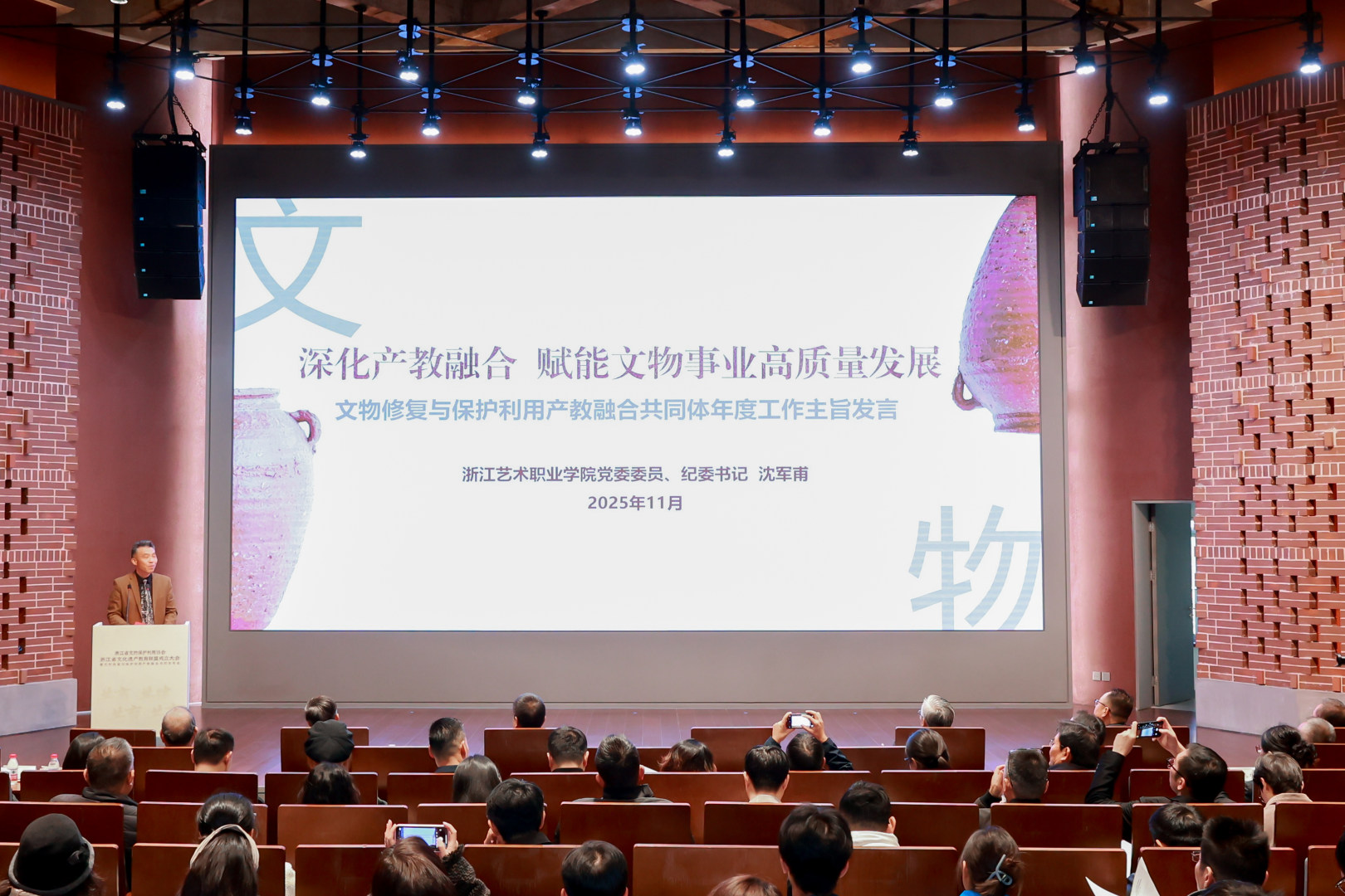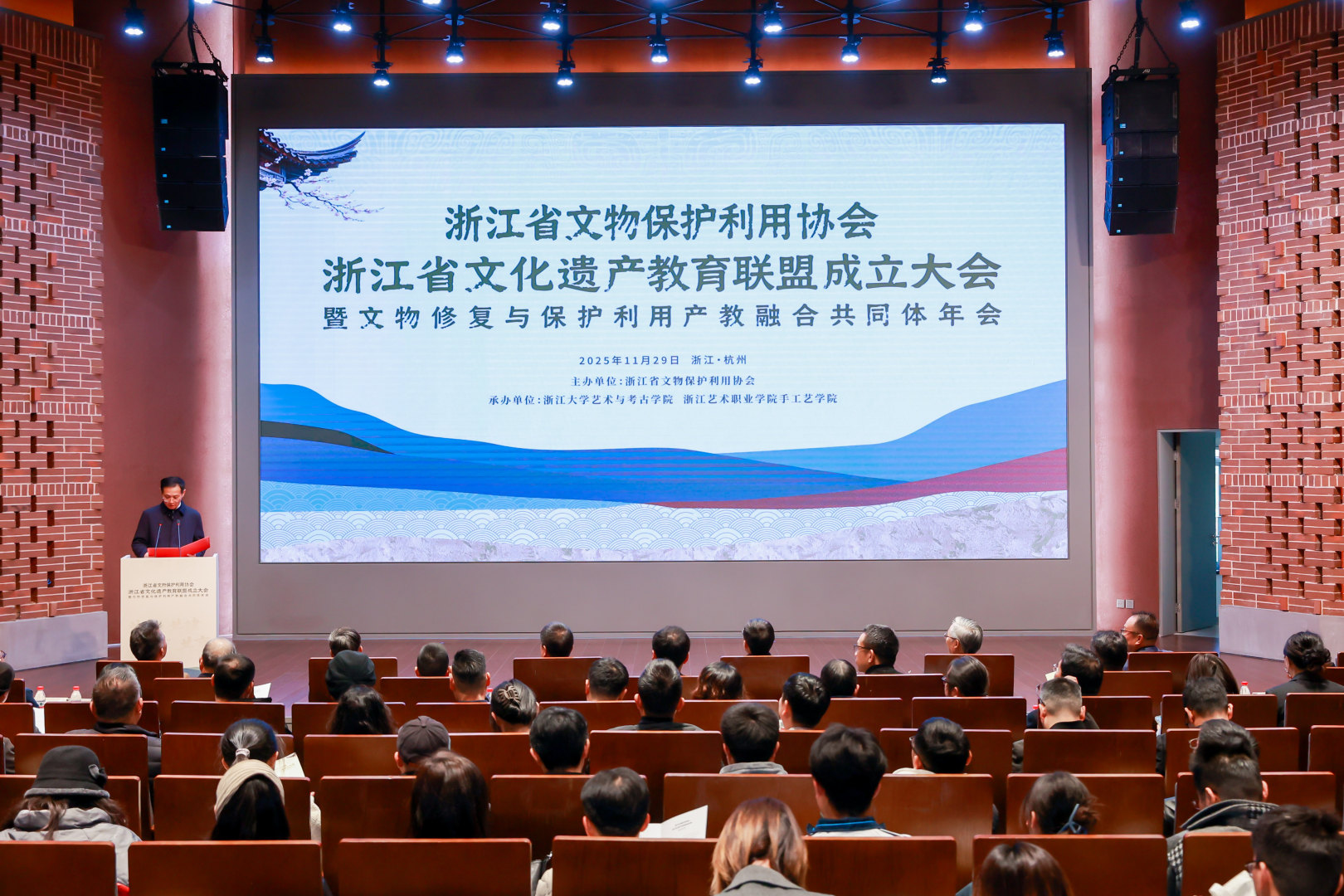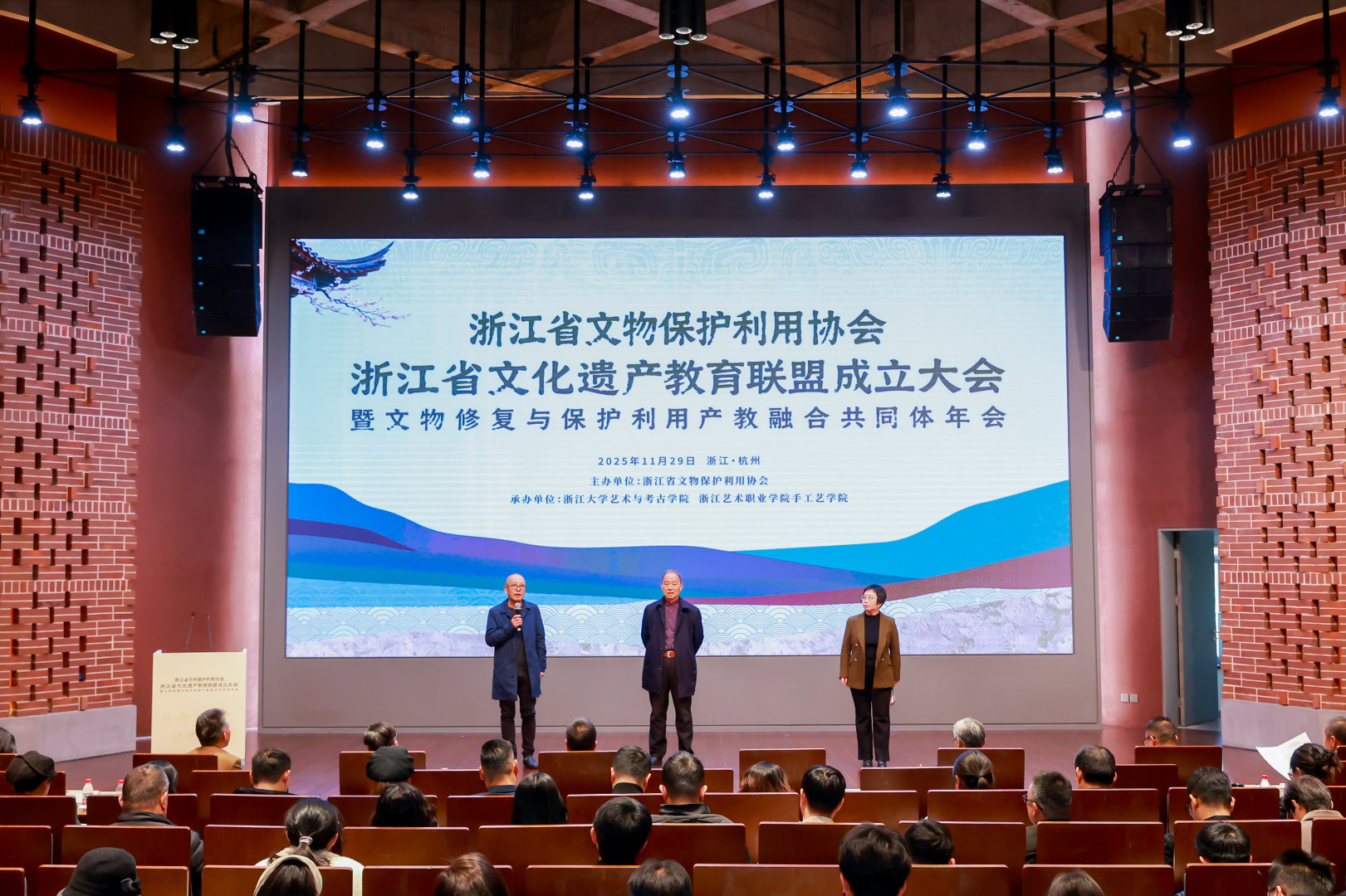 11月29日,浙江省文化遗产教育联盟成立大会暨文物修复与保护利用产教融合共同体年会在浙江大学西溪校区逸夫科教馆举行。本次会议以“共商、共建、共育、共享”为主题,汇聚行业协会、高校、职业院校、文博机构和科研院近200余名代表,共同推动文化遗产领域产教融合与人才培养体系建设。