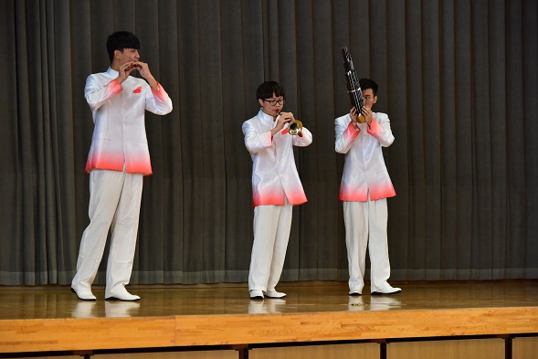交流演出节目,从唢呐独奏和舞蹈《正月十五闹雪灯》,越剧《那时候的好回忆》,独唱和舞蹈《花儿为什么会这么红》,二胡独奏《赛马》,笙独、笛子、双人舞《少年四弦合欢花》,笙,笛子,唢呐合奏《百鸟朝凤》,到独唱《美丽的浙江》,每个节目都十分精彩。我们艺术团中的演员年龄虽小,高强度高密度的行程让我们看到了专业舞台的适应能力和应变能力,值得点赞。每位同学访日期间都表现出了极高的专业素养,除了演出之外的勤学苦练外,每场演出前,到达目的地之后,和老师们一起快速对接音乐,音响,匆匆走台快闪,充分发挥了不怕苦不怕累的专业精神。