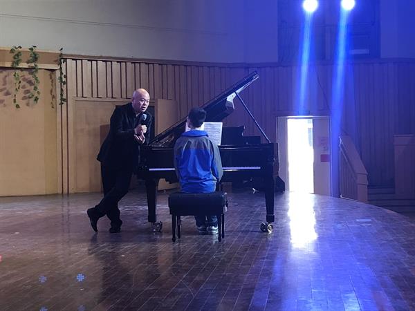 来自16小音乐班李诺舟、16键盘一贯班茹则霖、14小音乐班卢涵冰、15键盘大专班潘晓洁4名同学分别上台演奏了巴赫《平均律》第六首、肖邦《练习曲》第五首、莫什科夫斯基《练习曲》第一首和肖邦《练习曲》第一首共四首曲目,涉及巴洛克和浪漫主义时期的不同流派风格。4位同学时而委婉抒情时而昂扬振奋的演奏收获了现场观众的赞许。徐军针对4名同学的表演,分别进行了现场指导,尤其是每个人所反映出来的不同问题,予以了建议和修正。当遇到言语讲解很难令人心领神会的时候,徐军便直接示范演奏,飞速流动的音符所透出的精湛技艺让师生们折服。他尤其强调了钢琴演奏中颗粒性、力量二者的重要性。为了让接受指导的同学更为直观地理解何为“松弛”状态下的正确演奏,他还带着同学一起在舞台上摆出各种体态姿势帮助领会,现场互动交流气氛热烈。来自14小音乐班卢涵冰同学是4名同学中年龄最小的,今年才高一,他的演奏得到了徐军的高度评价。