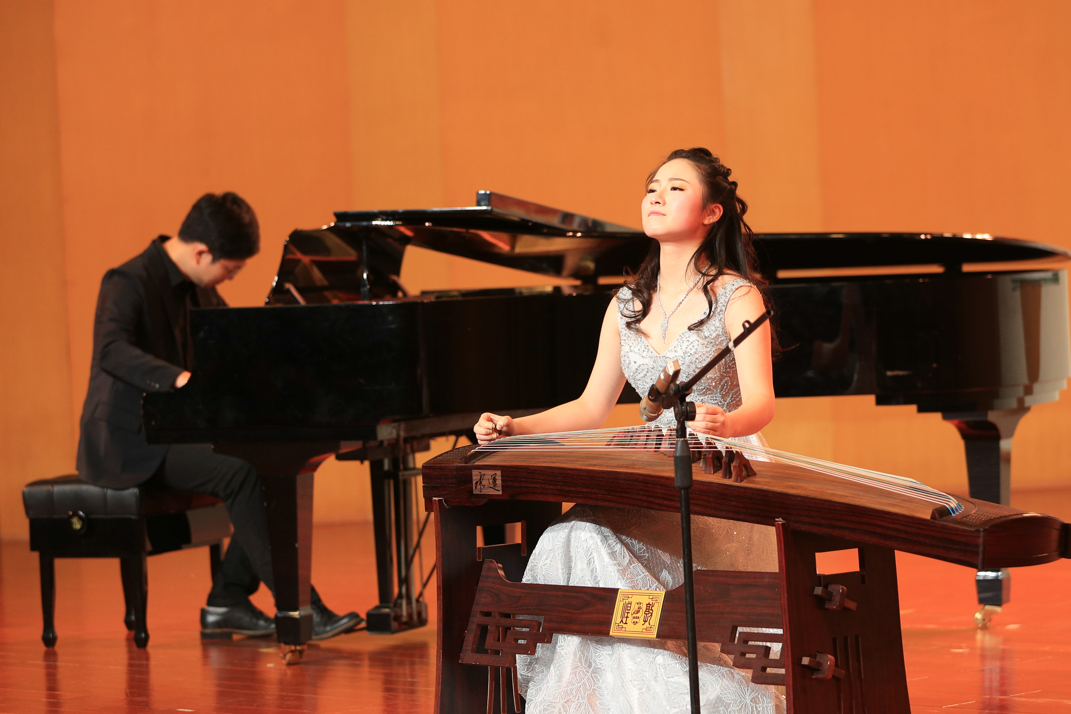 晚会由许诗悦的专业指导教师、音乐系民族器乐教研室青年教师段廉担任主持,她向观众细致讲解了每部作品的创作背景、文化内涵、指导过程。在长达一个半小时的音乐会中,许诗悦为在场观众带来由周煜国、周望、王丹红等名家创作的7首不同风格、不同形式的古筝名曲,当中既有古筝独奏《西部主题随想曲》、古筝协奏《云裳诉》《如是》,也有群筝《忆长安》、钢丝筝独奏《陈杏元和番》、古筝独奏《关山随想》,日本作曲家三木稔创作的七声弦制筝独奏《风·雨》更是为音乐会增添了几许异国情愫。音乐会特邀上海音乐学院艺术指导熊壮壮、浙江歌舞剧院民族乐团打击乐声部长王富生担任《云裳诉》《如是》《西部主题随想曲》三部作品的协奏,多重乐器的交相辉映令筝曲焕如新生。作为一名即将毕业的在校生,许诗悦全情贯注的表演和出色的舞台感染力赢得了现场观众的热烈掌声。