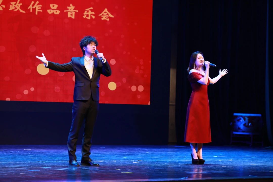 晚上七点,音乐会在浙艺青年学子徐士源、陈幸儿演唱的序曲《盛世闪耀中国红》中拉开帷幕。歌曲以极具代表性的中国红为主题,讴歌了五千年中华文明,赞美了浙江人民紧跟伟大复兴领航人踔厉笃行的信心与决心,描绘了一幅盛世中华的时代风貌!自古以来,中华民族就有崇尚红色的习俗,它记载着中国人民的心路历程,经过世代承启、深化和扬弃,其传统精髓逐渐演变为中国文化的底色,它象征着中国人民热忱奋进,忠诚勇敢,团结友爱的民族品格!这是一首激情澎湃的盛世赞歌,激昂的歌声深深打动了台下观看演出的浙江警察学院的学生们,他们报以持久而热烈的掌声!