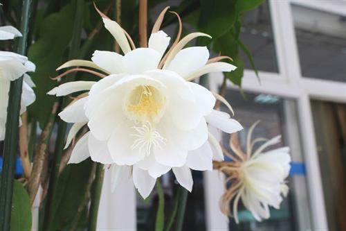近日,在浙艺院一楼食堂展台,我们颠覆了电影中的画面,有幸在白天看到了清新素雅的昙花。这盆昙花以饱满的姿态盛放着,开放数达到8朵,甚至还有2个含苞欲放的花苞。许多路过的师生停下脚步,纷纷上前观赏这盆神奇美丽的昙花,时不时还有人拿出手机来拍照。这盆昙花出自哪位高手?他就是我院基础教学部退休教师徐洪江。