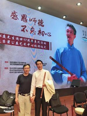 纪念馆分4个版块,浓缩了赵松庭先生的艺术人生、艺术成就、艺术传承和艺术展望。纪念馆的每件展品吴樟华都觉得留存着先生的艺术精神。顶着赵松庭“嫡传弟子”头衔,吴樟华感到既光荣又有压力。光荣,是自己有幸于1980年考入浙江艺术学校,成为赵先生的弟子。1985年至1988年又留校当了青年教师,成为赵先生的助教。1988年在赵先生的推荐下,顺利考入中国音乐学院,成为继杜如松(1985年考入上海音乐学院)、戴亚(1986年考入中央音乐学院)之后又一位考入中国三大音乐学院的赵松庭弟子。2008年又从绍兴艺校校长任上调回浙艺院担任竹笛教师。期间,吴樟华担任过音乐系副主任、附中校长等职,2012年起,担任学校科研处长和创作中心主任。压力,一是来自业界,二是自己给予的。即,今天的吴樟华坐在浙艺院竹笛教师岗位上,培养了多少竹笛演奏人才,写出了多少竹笛独奏曲,研制了多少竹笛科研项目,说白了,离老师的期望有多远,又为老师做了些什么?